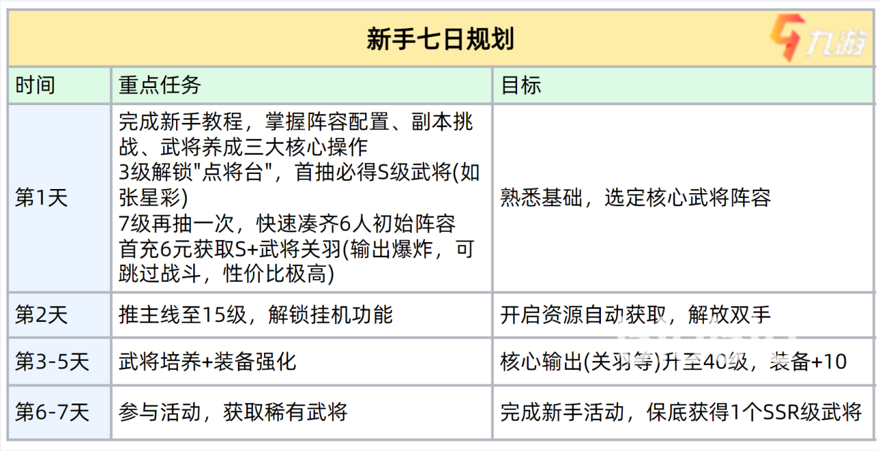 新手目标:提升角色等级,收集强力武将,组建顶级阵容,挑战各类副本和玩家,最终成为"巨神军师"。