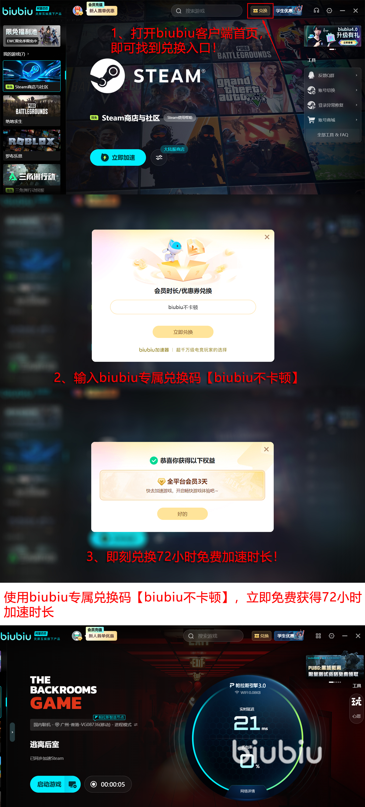对于没用过的玩家来说,还是有点怀疑。还好新人注册后可领取24H的免费加速,就能率先体验,就能发现加载起来特别快!若是还想体验更长时间,破解更多谜题!新老用户均可输入兑换码【biubiu不卡顿】,就能额外获得一次三天免费加速。对于新手来说,总共即可获得96H的免费加速啦!
