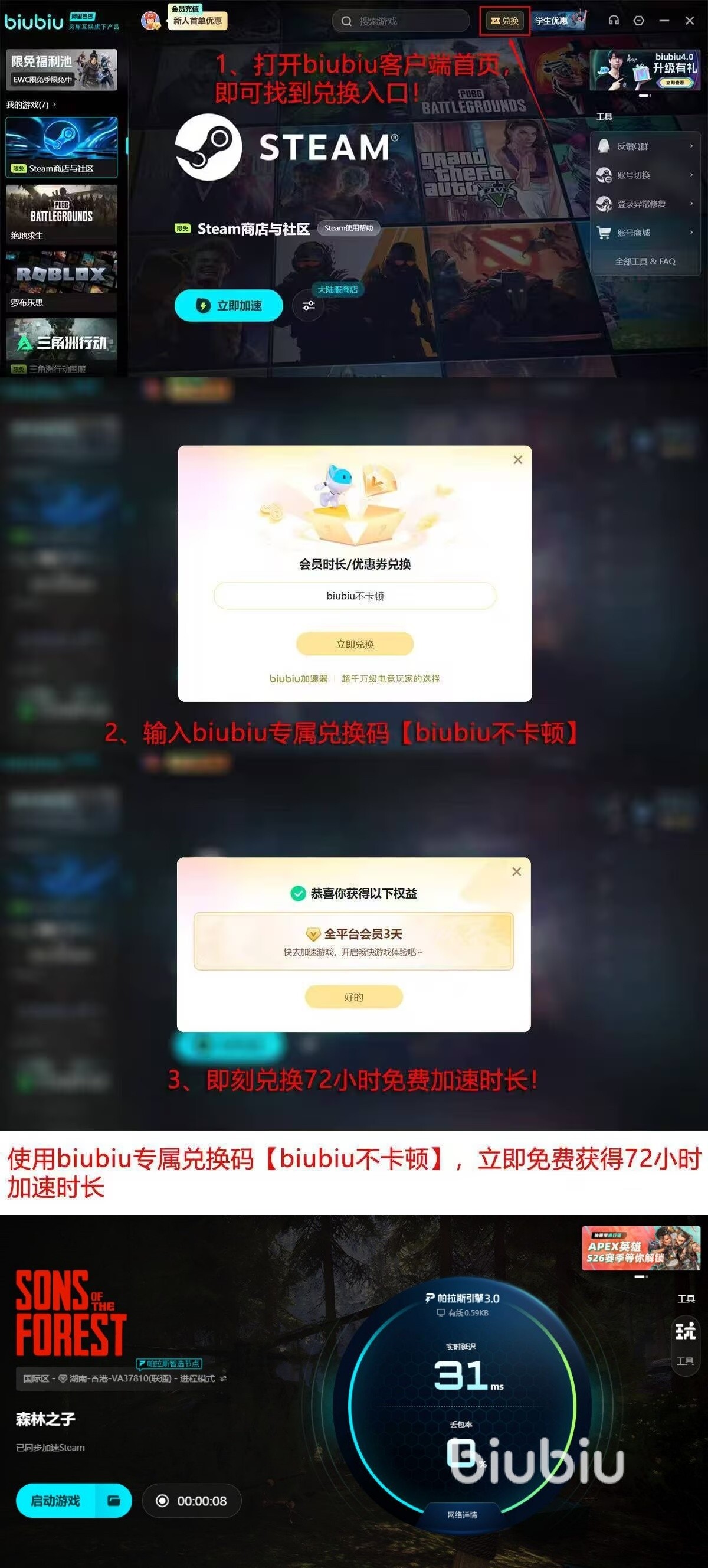 平台同步提供多项实用权益:新用户注册即赠24小时全游戏免费加速服务;输入口令【biubiu不卡顿】可立即兑换3日高级会员权限;累计加速时长近100小时,覆盖《森林之子》全部地图与联机模式。此外,内置游戏资讯专区持续更新开荒路线、资源分布热力图及实战对抗技巧,所有内容均向玩家免费开放。