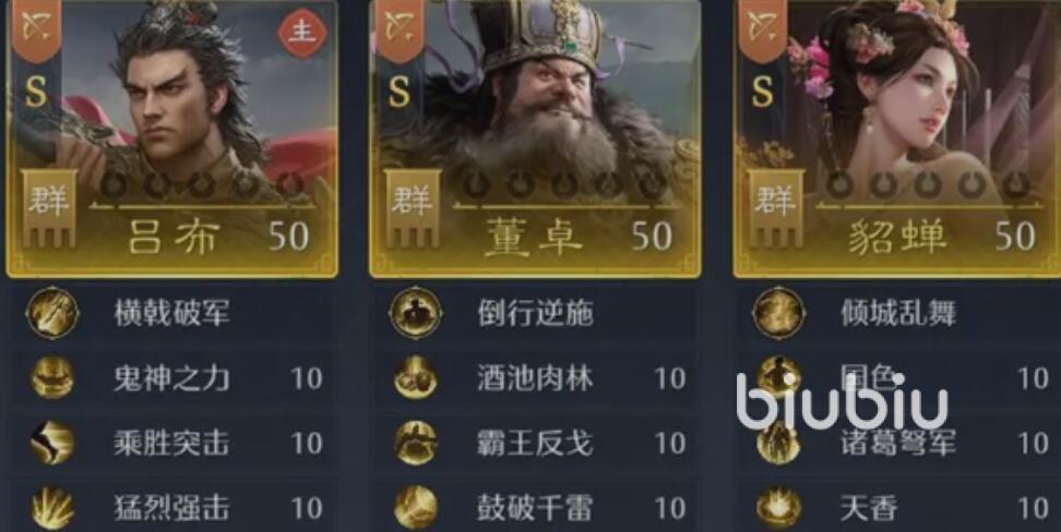 该阵容由吕布、董卓、貂蝉三人构成,定位清晰:吕布为绝对主C,以弓兵形态触发高频率连击,配合专属技能打出多段物理伤害;董卓与貂蝉则承担双辅定位——前者提供前排抗压与碎甲增益,后者负责怒气回转与生存支援。三者形成“输出—破防—续航”的闭环体系,整体容错率高,适合中后期推图与PVP对抗。