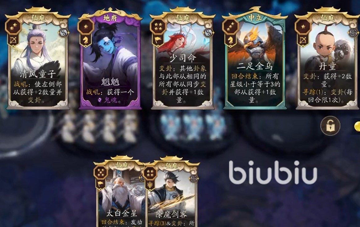 黑卦流聚焦于黑卦部从的数量叠加与战力滚雪球。核心卡组包括瑶池仙子、除魔剑客、救苦仙尊、太白金星与天罡星君五张固定卡牌,剩余两个上阵位可根据实战需求灵活调整。该流派高度依赖“寻踪”(由天书刷新触发)与“变卦”机制的协同——通过精准变卦激活黑卦专属增益,持续扩大己方单位规模。成型后的黑卦流具备越级挑战能力,战力上限突出,在中高难度副本与PVP环境中表现优异。