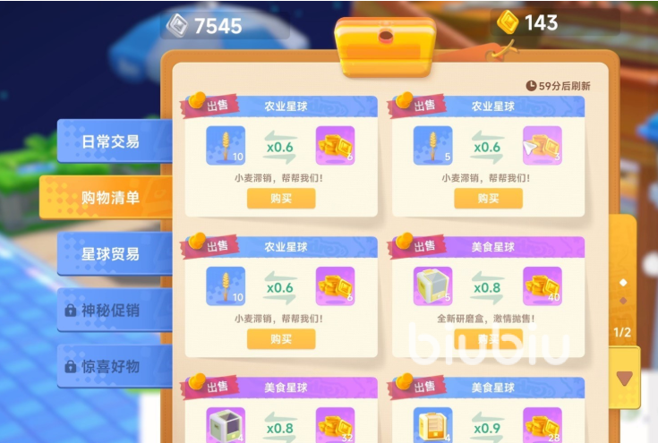 值得注意的是,不同星球的杂货店存在价格浮动机制。同一类道具(如基础家具或通用种子)在各星球标价不一,玩家可通过星球贸易板块横向比对,择优采购以提升资源使用效率。此外,“神秘促销”与“惊喜好物”板块会不定期上线限时折扣,部分高价值成长道具在此期间可达历史最低成交价。