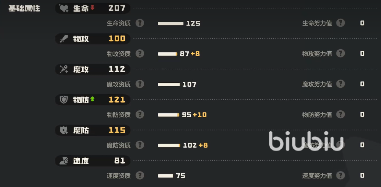 属性加点建议以防御与生命值为绝对优先级,二者协同提升其承伤阈值与站场时长;速度属性可微量补充,确保关键技能释放顺序,但无需堆叠至高速梯队;魔法攻击属性无实际作用,因其全部技能均为物理类型,该维度可完全忽略。