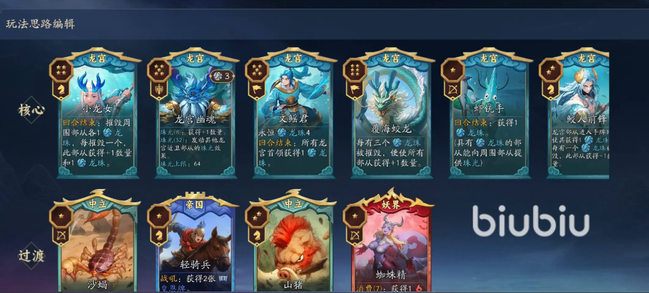 敖广代表龙宫势力,核心优势在于拓展“龙珠”容量上限,并强化龙珠激活后的增益效果(即珠光效果),显著加快队伍整体成型速度。实战中可搭配四海龙王组合,触发“双回合结束”机制,在单局内实现高频次攻击轮次与单位数量压制,形成阶段性统治力。