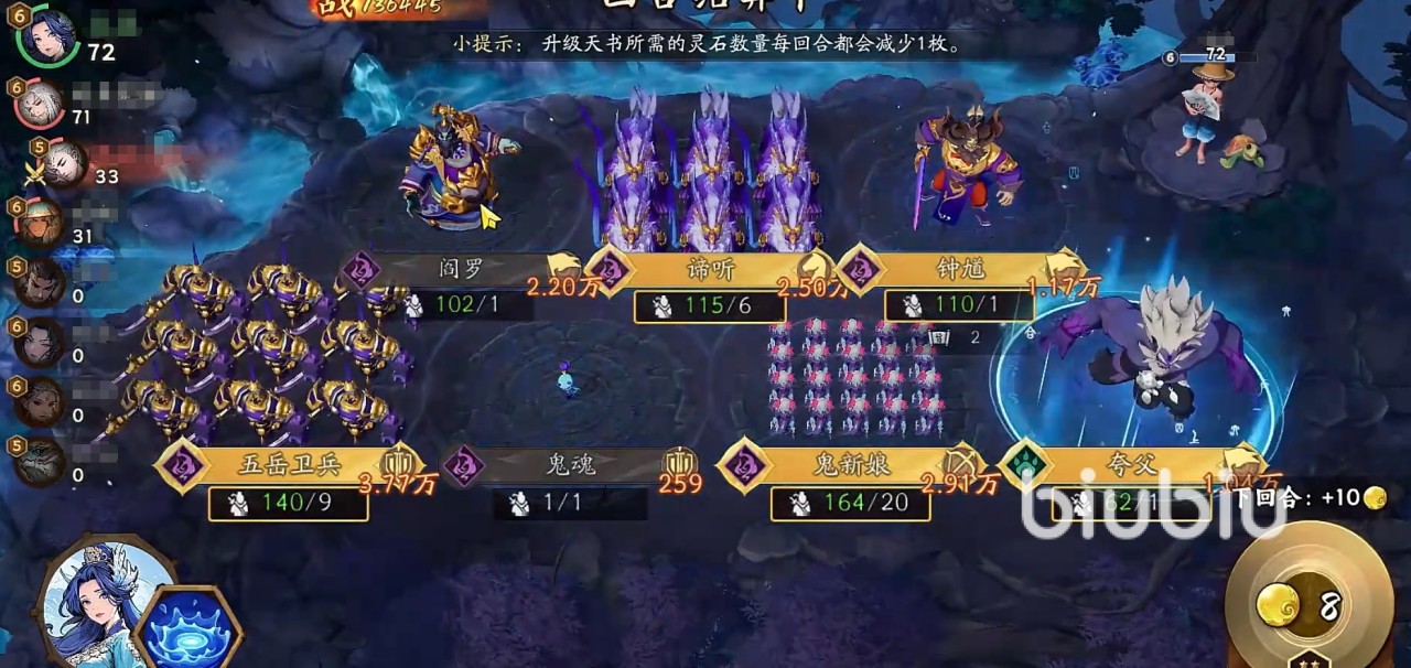 地府主打规模压制,核心逻辑为“天书五级→锁定忘忧+黑白无常→一级部从上阵即摧毁→生成小鬼→集满100只召唤阎罗”。阎罗登场后每回合自动产出小鬼,形成稳定兵力补充,配合地府特有成长机制,阵容强度随时间推移呈阶梯式跃升,上限极高且具备极强的持续作战能力。