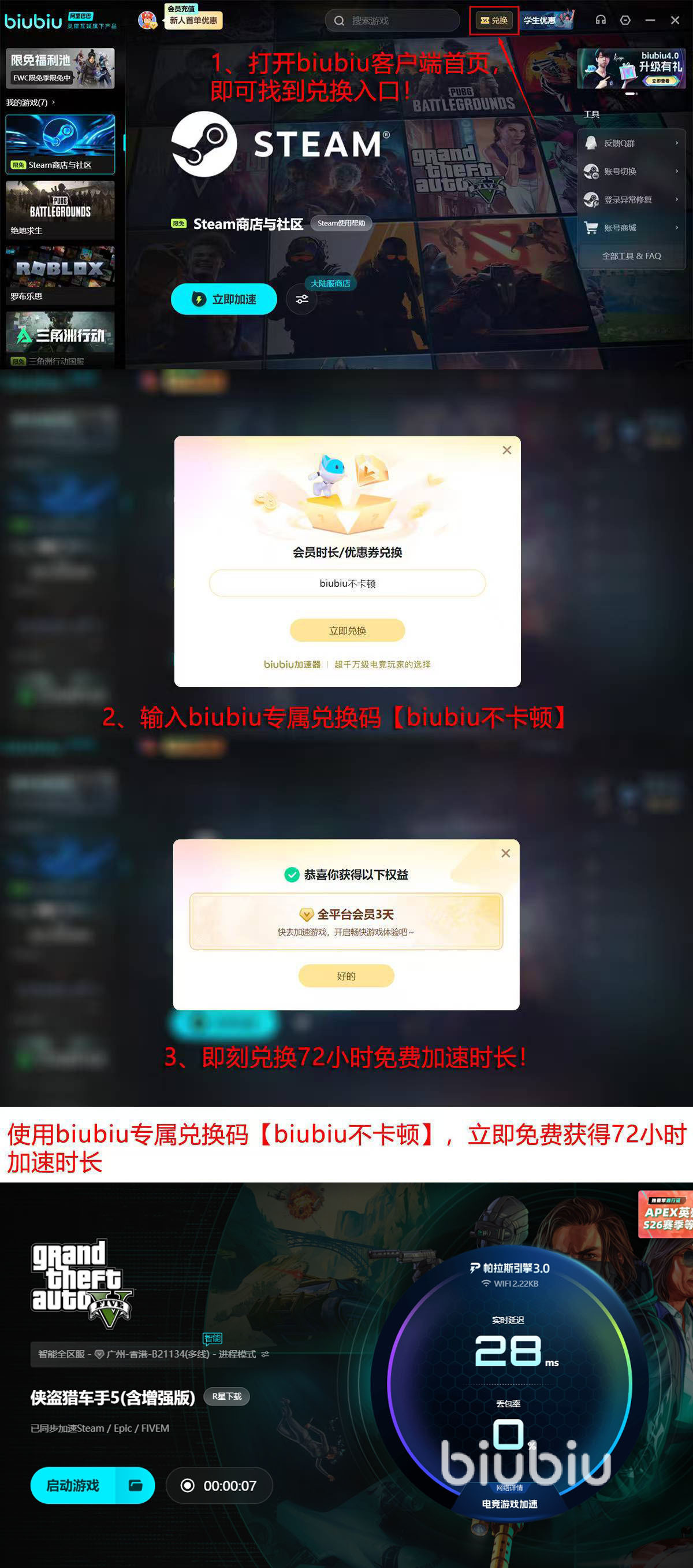 使用biubiu加速器后,GTA Online的全流程体验明显优化:从账号登录、角色载入,到街头竞速、帮派火拼等高动态场景,均可保持画面流畅、操作响应及时。新用户完成注册即可立即领取24小时免费加速时长;升级为正式会员后,输入专属口令【biubiu不卡顿】,可在首页兑换额外72小时加速权益,累计可享总计96小时无门槛试用机会。