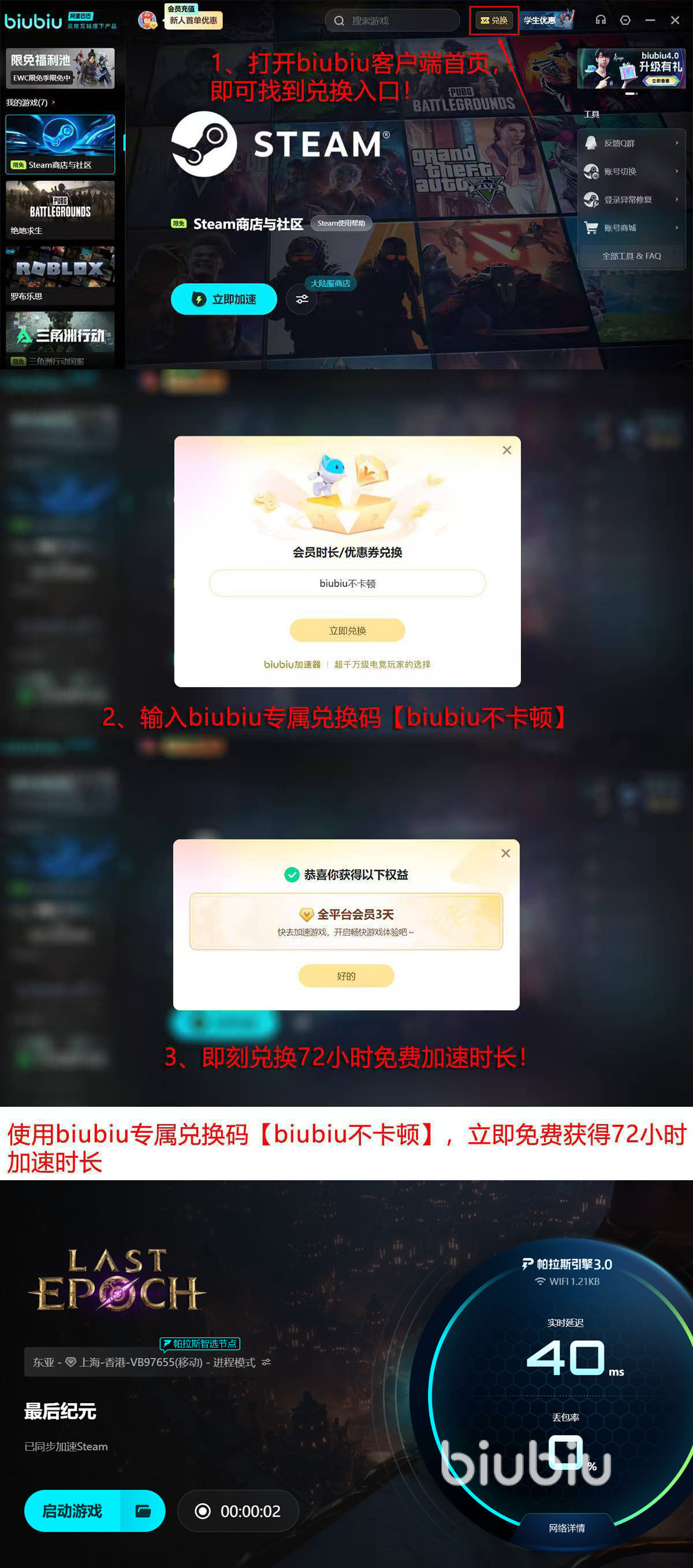 使用biubiu加速器后,《最后纪元》的装备锻造流程、精英怪战局应对及跨服PVP对抗均可获得明显流畅度提升。新用户注册即享双重福利:首次登录自动发放24小时免费加速时长;另可通过会员中心输入口令【biubiu不卡顿】,兑换额外72小时服务。两项权益叠加,新账号总计可获得96小时无门槛体验周期。
