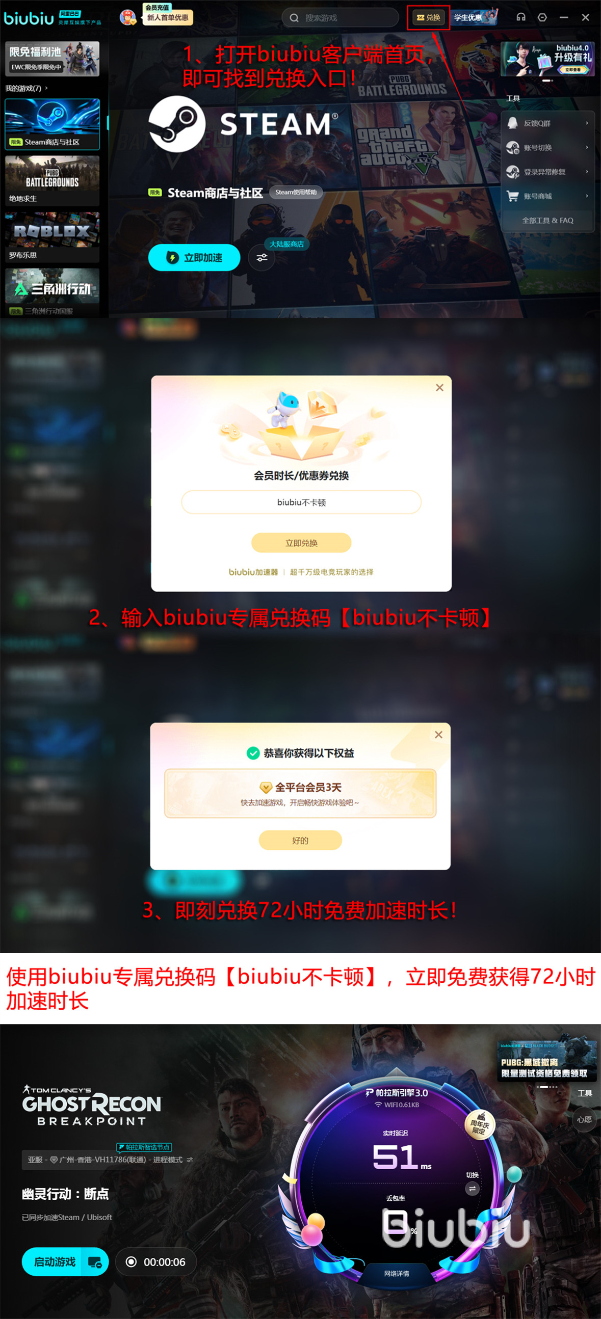 最后再给大家介绍一下biubiu现在的两项主要福利,第一项是新注册号免费加速24小时,只要注册号打开直接就能免费加速,非常方便。还有一项是将兑换码【biubiu不卡顿】填写进兑换栏中,这样可以兑换72小时会员时间,每个号都能兑换一次,千万不要错过。这样新号两项福利都能享受,总计96小时完全够用了。