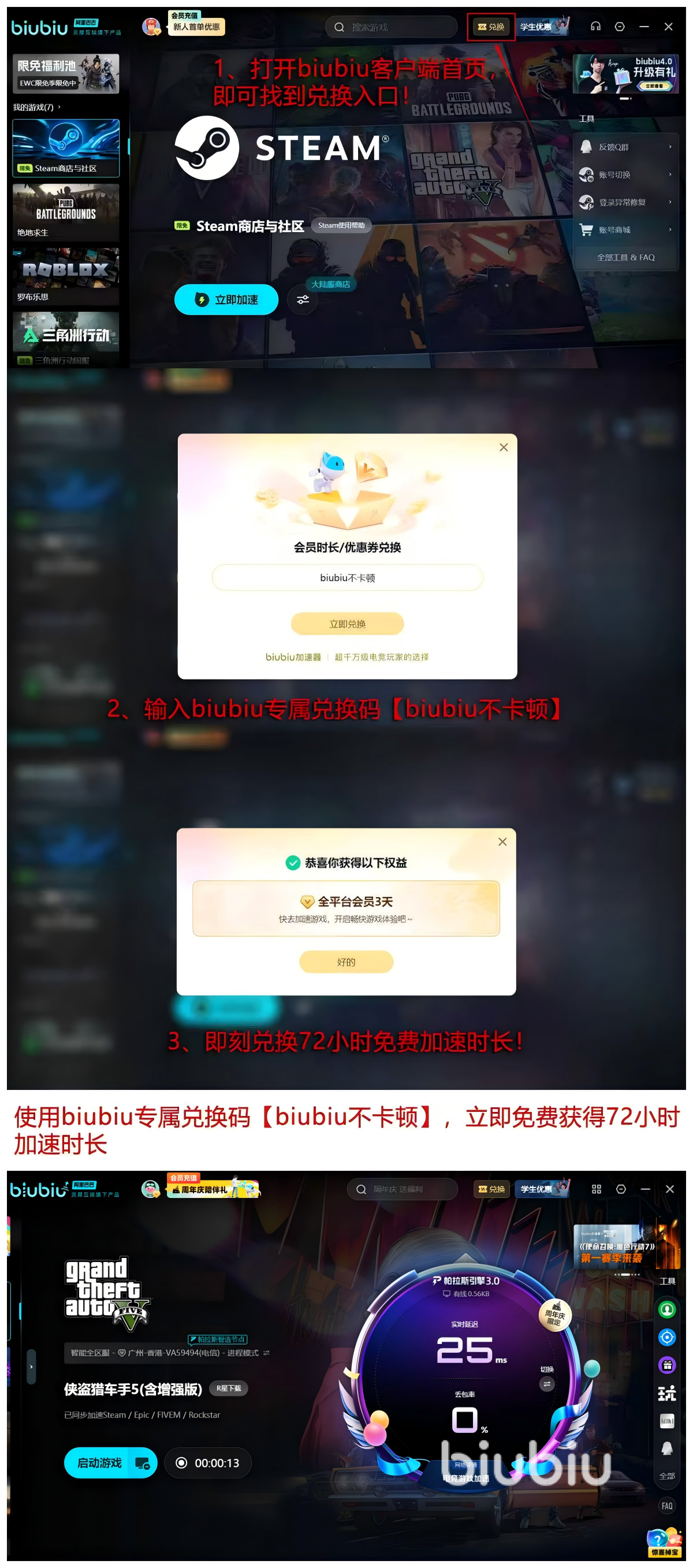 【biubiu不卡顿】作为游戏当中的显性福利,输入就能获取72小时折算为三天的会员时间,包括新手的24小时,让各位收获的奖励大大的上升,保证自己先体验再游玩,是非常良心的加速器,感兴趣的玩家赶快来了解一下吧。