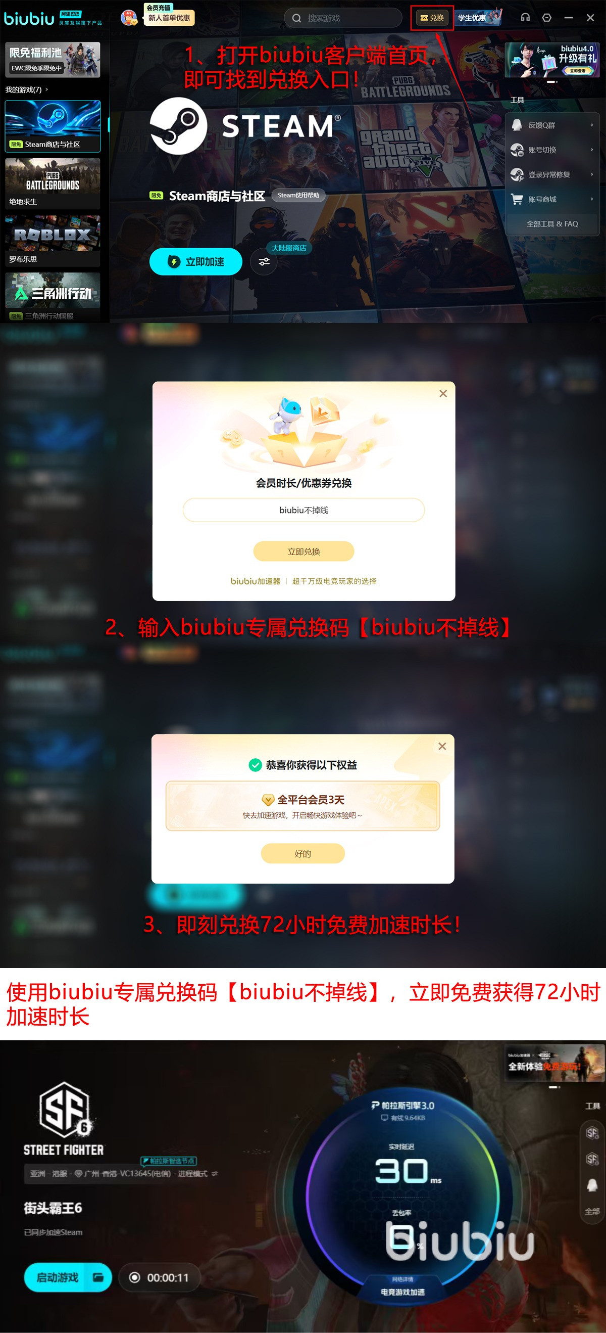 心动不如行动,biubiu知道新用户要亲身体验才信服,所以真心诚意送出重磅入门福利,成功注册Biubiu账号之后,立刻就能激活首日零门槛感受加速效果24小时,而且使用【biubiu不掉线】还能继续丝滑对战72小时,双倍福利叠加起来,新用户就能畅享总共4天时间。