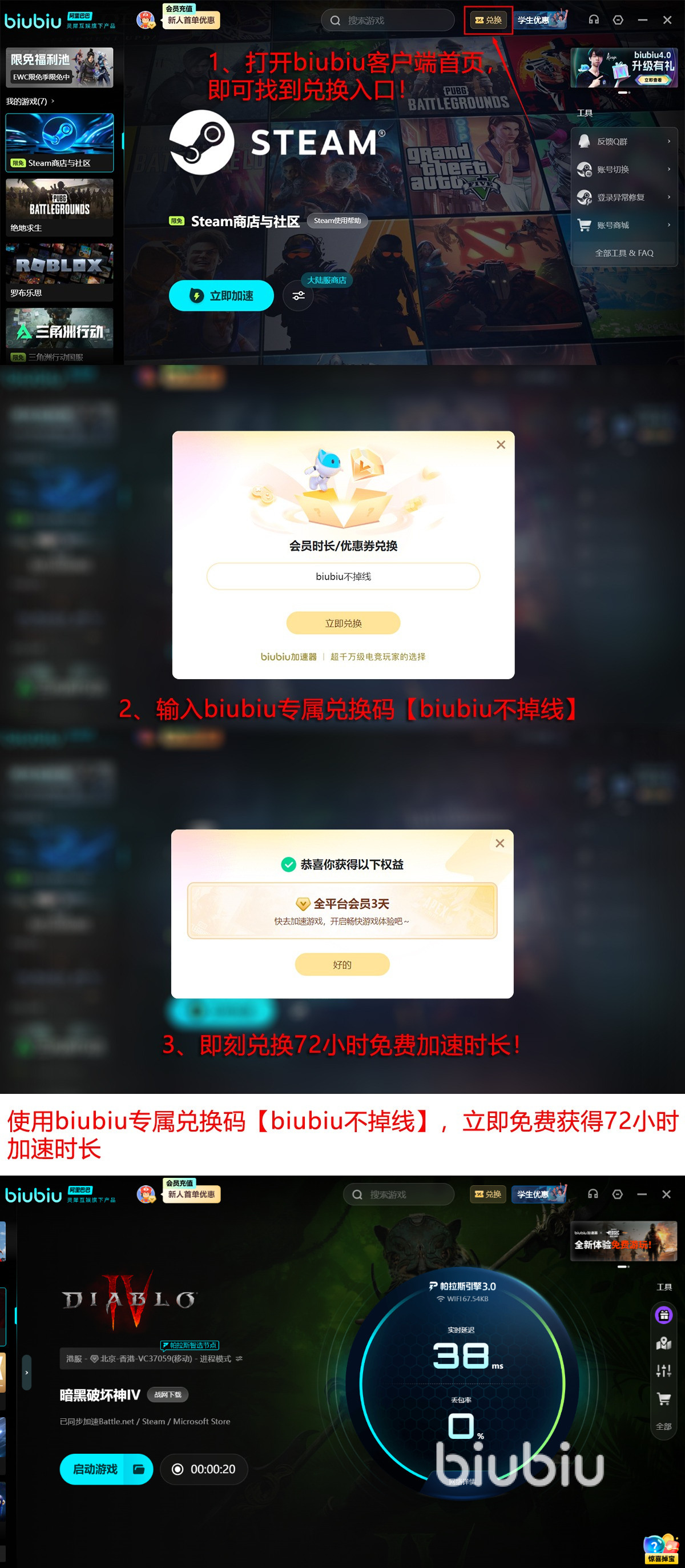 对于初次接触的新玩家,biubiu加速器更是诚意十足,新用户注册之后就能立刻开始首日全功能免费试用24小时,而且更加令人欣喜的是只需要使用【biubiu不掉线】就可以继续进行最初的冒险旅程72小时,也就是说新玩家可以总共体验长达96个小时的无费用验证加速效果。