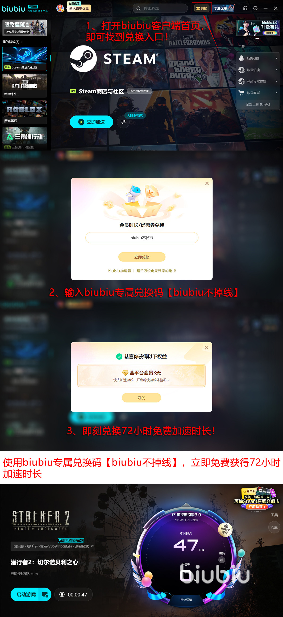biubiu还经常准备好礼给广大用户朋友们,有一个密钥码【biubiu不掉线】各位别忘了,可以支持72小时的免费使用,如果还是首次注册那系统必将额外送上24小时,叠加起来足够四整天的飞速体验了。