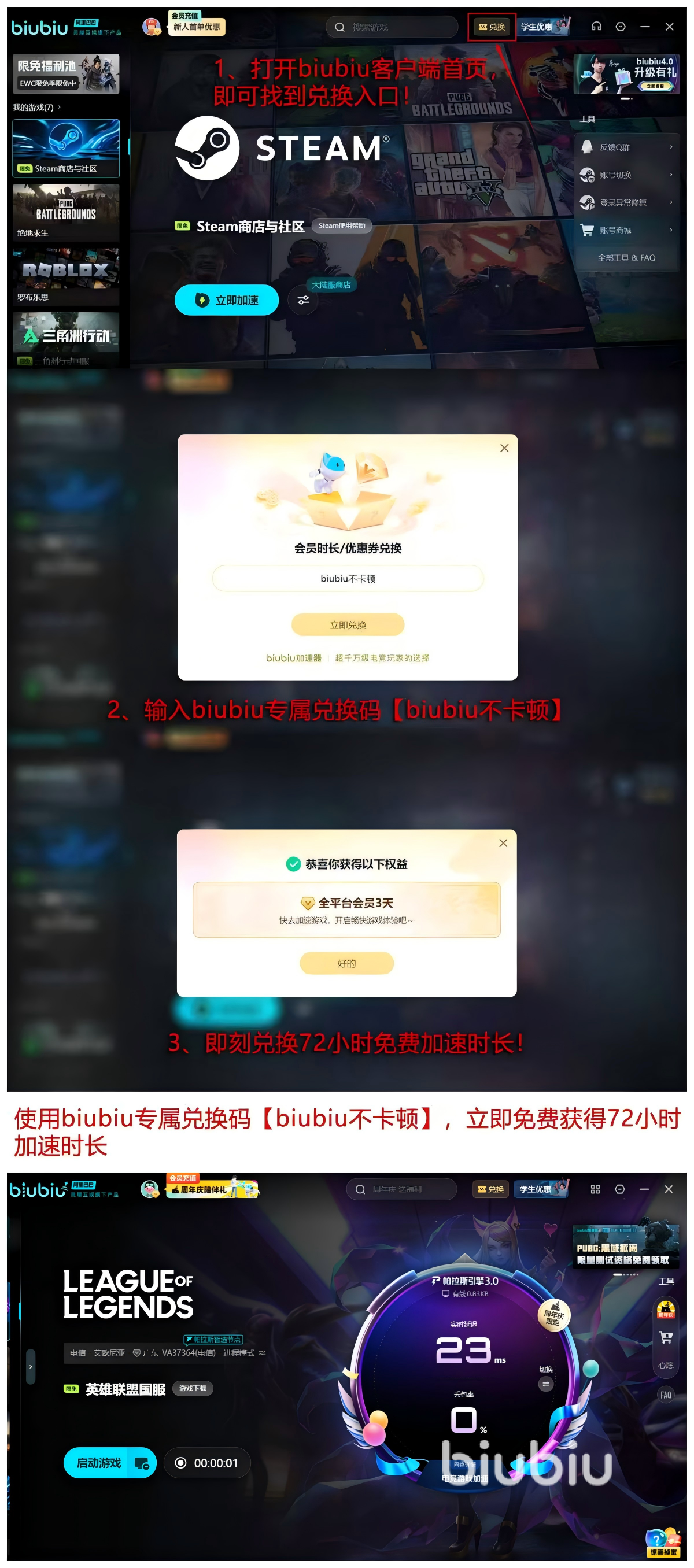 都想加速但是会员加速付费,可以了解一下【biubiu不卡顿】得口号,为各位玩家准备一下加速得体验,获得72小时得时间,24小时新人免费,可以相互叠加,总计获取96个小时得加速,这个对于玩家来说意义非凡,总是能够让很多不知情得玩家收获福利。