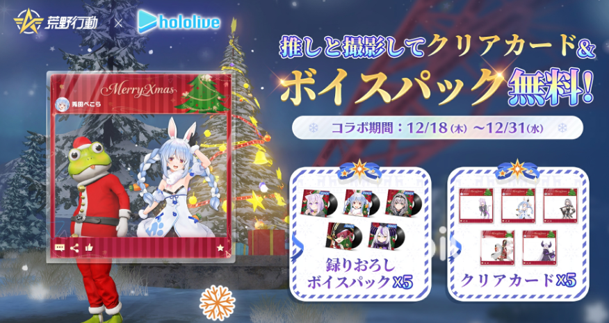 本次联动还特别加入了轻松有趣的圣诞拍照打卡玩法,玩家们只需要在游戏内指定的、精心布置好的圣诞场景中进行拍照打卡,就可以轻轻松松获得hololive成员原声录制的珍贵联动语音包。