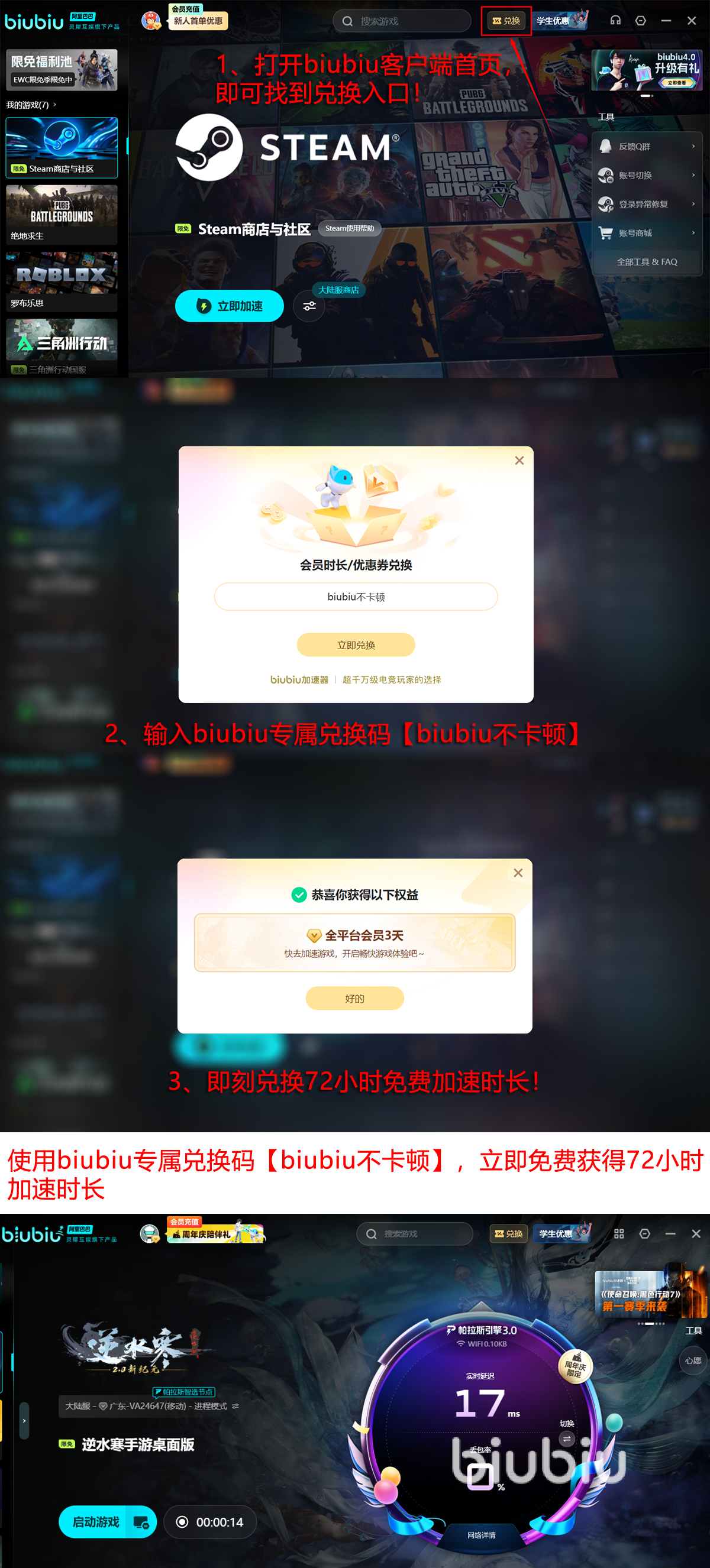 没用过的人对这些加速效果还是存在疑惑,所以可以先尝试注册一下,就能马上拥有新人24H的免费加速,用过之后才会发现关于网络的问题,都统统解决了!接着新老用户还能使用兑换码【biubiu不卡顿】,输入确认后就能额外获取一次三天免费加速,随心畅玩更长时间!