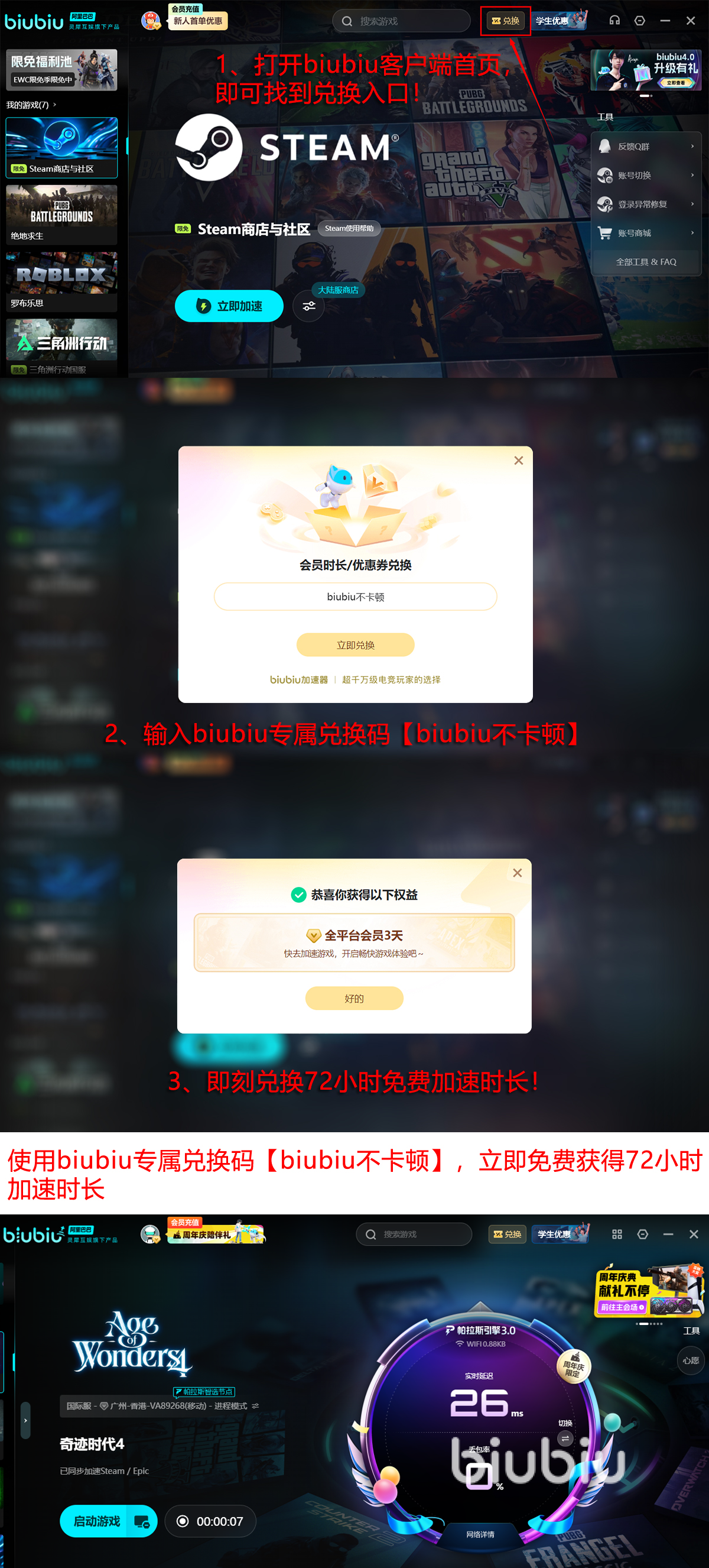 要是新用户的话,仅需注册后就能获得24H的免费加速,用过之后才会发现就算玩再久,也依旧不会闪退!若是打算继续多玩一段时间,那就可键入兑换码【biubiu不卡顿】,就能额外享受三天免费加速,新老用户均可使用一次,延长游玩时间!