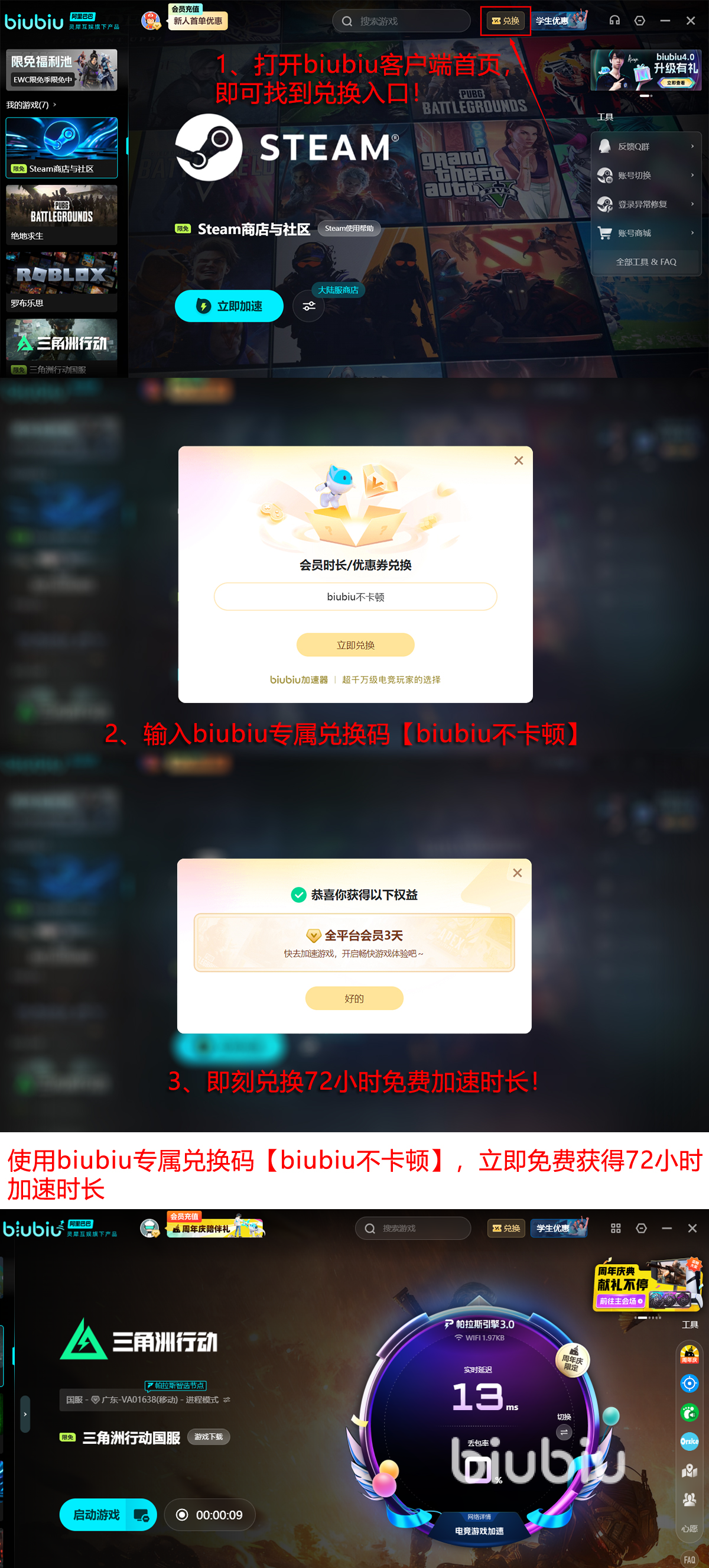 部分玩家还对加速效果存疑,此刻可先注册一下,即可荣获新人24H的免费加速,可以先解决闪退问题!若是打算和队友们继续参加搜打撤的比赛,那就可通过兑换码【biubiu不卡顿】,输入后就能额外获得一次三天免费加速,兑换码是每个用户都可享受一次机会!在如此长的时间内,足以获得大量的物资了!