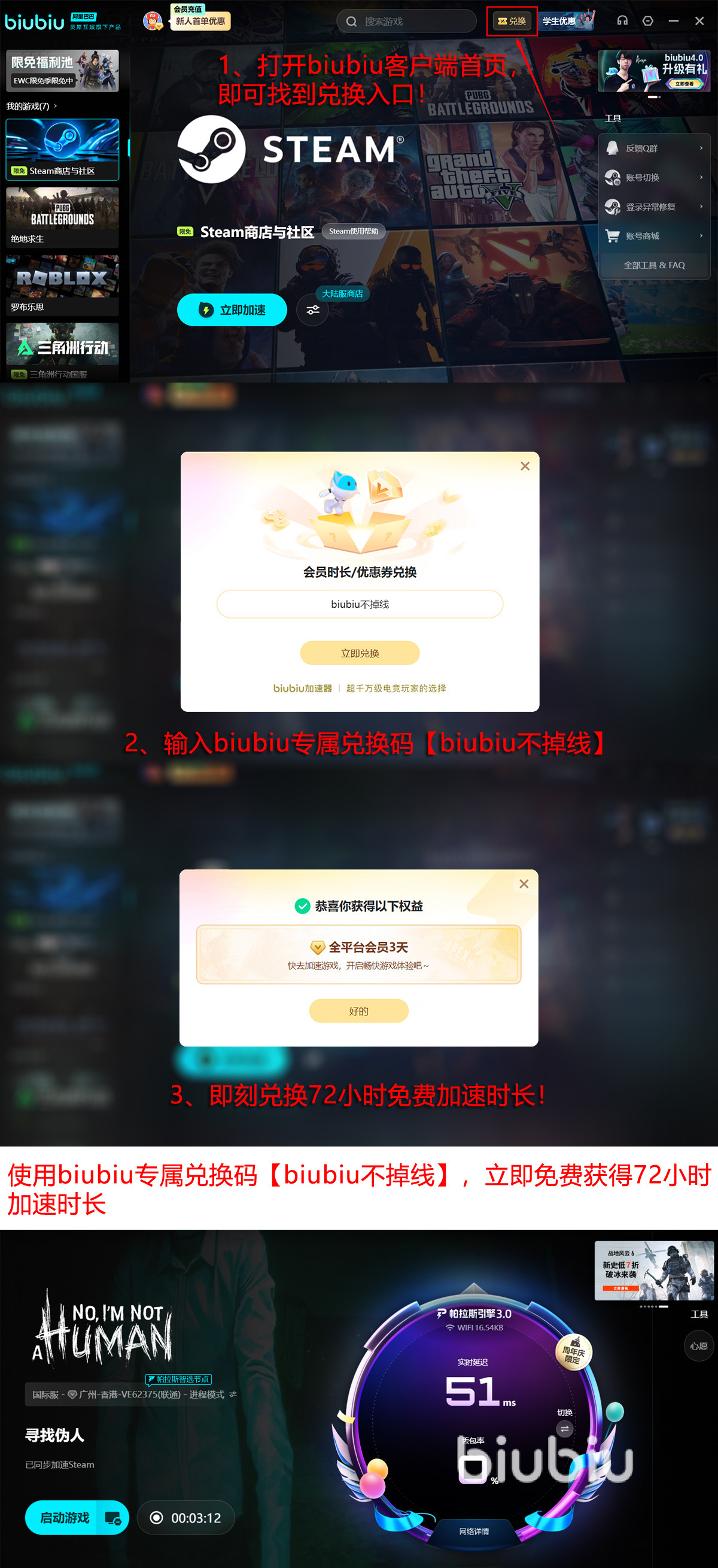 如果有付费的困扰,可以用一下【biubiu不掉线】这个密钥,直接充入72小时,如果还是首次注册的账户,可以再额外领到系统送上的24小时VIP,加起来也足有四整天了。