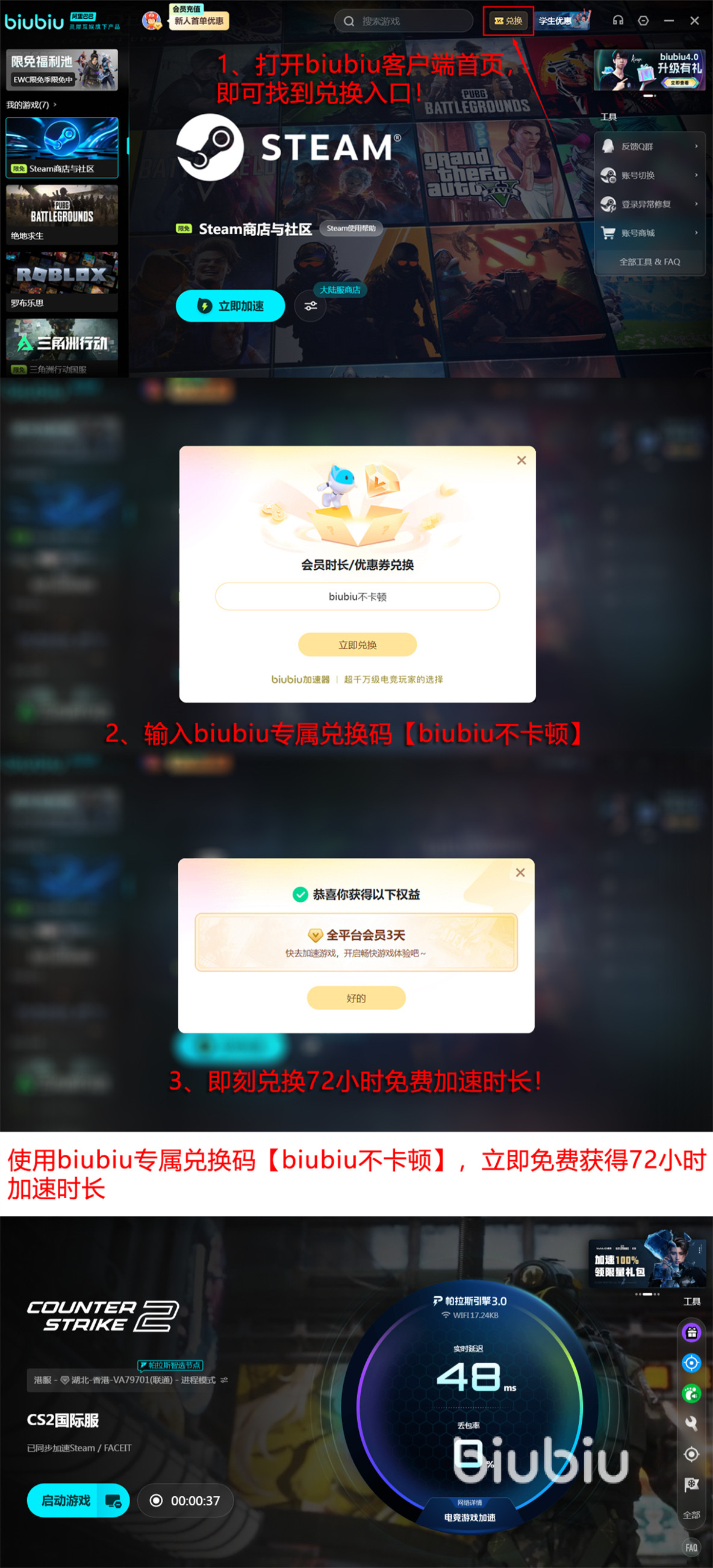除技术能力外,biubiu当前提供双重新人激励政策:新注册用户可立即获得24小时免费加速时长;另附通用兑换码【biubiu不卡顿】,每个账号限用一次,成功激活后额外获取72小时加速服务。两项叠加总计可达96小时,充分覆盖测试期所需全部使用场景。