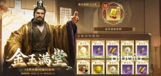 同步开启的还有周期性签到系统。活动期内每日登录均可领取对应日序奖励,累计签到满21天后,可直接领取高价值终极大奖——自选名将卡牌,涵盖多位S级武将选项,满足不同阵容构建需求。