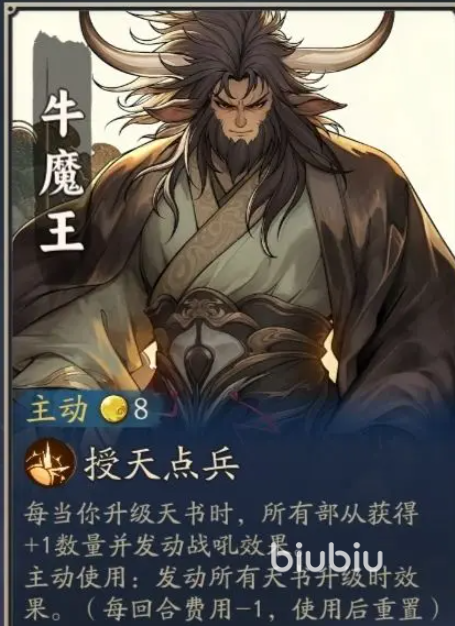 作为兼顾成长性与功能性的一线幻神,牛魔王的核心价值体现在天书升级阶段——每次升级可使全队部队数量+1;其战吼效果支持部从入场时的额外触发效果由自身重复发动一次;主动技能更可集中释放所有已升级天书的即时效果,在多段爆发与节奏控制方面表现突出。