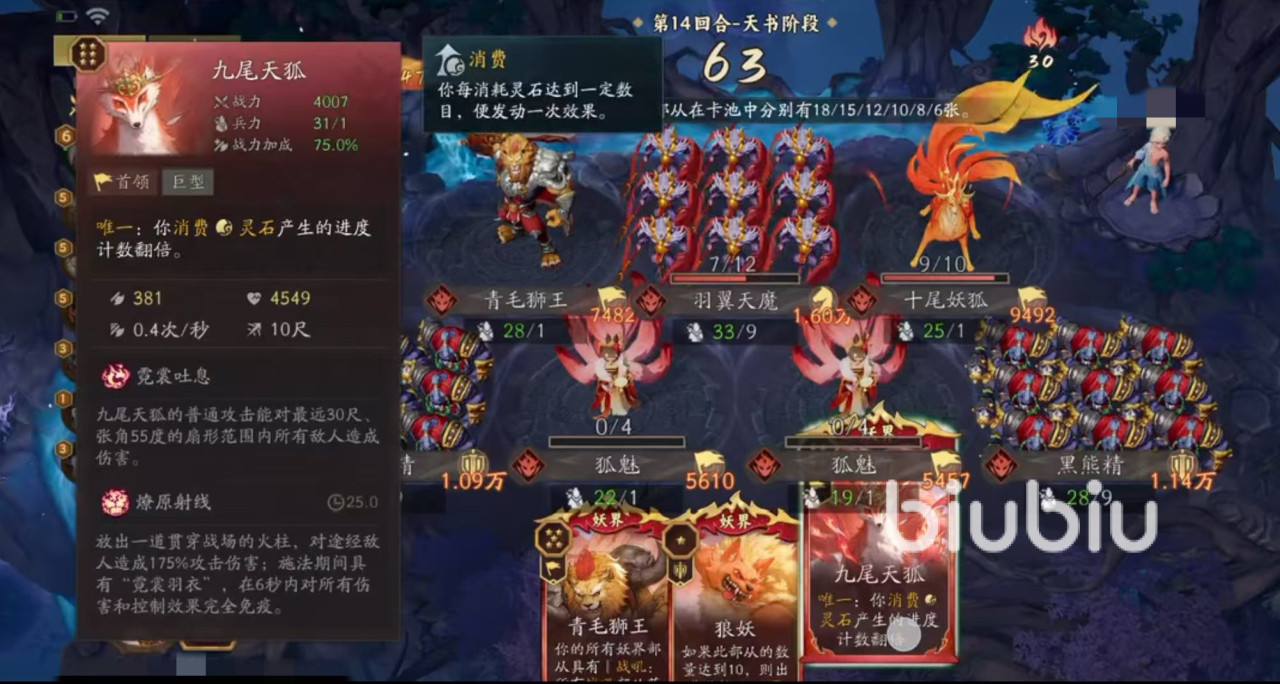 消费流强调“灵力→妖气→战力”的高效转化链。开局阶段应聚焦获取“蜘蛛精”,利用其每回合消耗7点灵力生成16点妖气的特性,在前三回合内达成5点妖气,触发稳定回血效果。中期过渡阶段推荐配置“女妖”与“天魔”,兼顾生存与锁血能力,为5级人口升级提供经济与血量保障。后期成型阵容以“羽翼天魔”(提升突击部队数量)、“金翅大鹏”(按突击部队数量产出灵石)、“九尾天狐”(使灵石消费进度×2)、“雷鸟怪”(再次增加突击部队数量)为核心,形成资源滚雪球式正向循环,实现战力持续跃升。