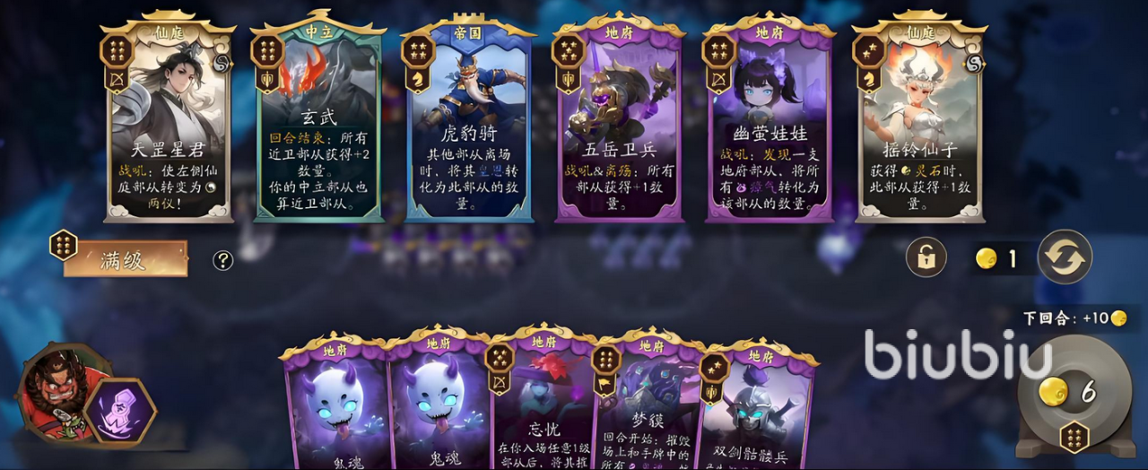 具体运营分阶段展开:前期依赖阴兵过渡,该单位每回合结束自动产出瘴气,并可触发鬼将技能,额外生成战士单位;此阶段应主动寻找击杀窗口,高效利用阴兵特性快速堆叠瘴气层数,建立属性压制。中期需补强奈何桥守卫与五岳卫兵——前者直接提升战士上限,后者则与小鬼形成协同,放大叠加收益。需特别注意,小鬼既是可参战的灵活单位,也是召唤阎罗的唯一资源,同时具备出售变现功能,因此管理小鬼存量是贯穿全程的关键操作。