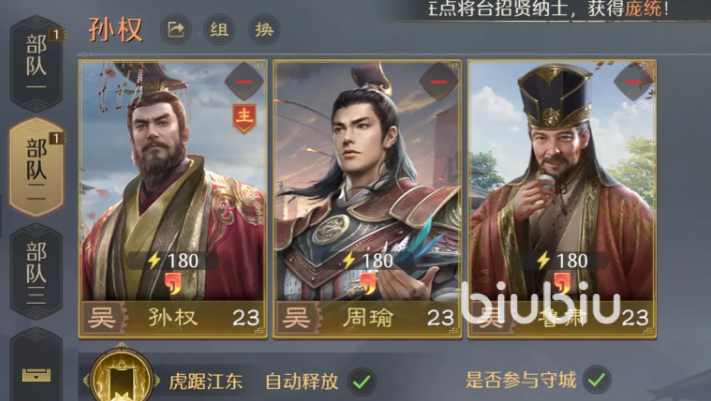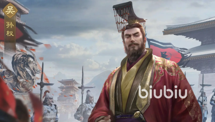 阵容采用孙权为统帅,承担主将职责。其核心价值在于加速全队技能循环节奏:通过搭配怒气回复类技能,显著缩短“虎踞江东”的释放间隔;同时配置具备伤害转化回血效果的技能,在维持输出强度的同时保障自身兵力健康度,有效延缓退场时间。孙权基础属性全面,兵力与骑兵适性均为S级,领兵值达14200,统帅与智力属性突出,完全胜任前排指挥与中坚承伤双重角色。
