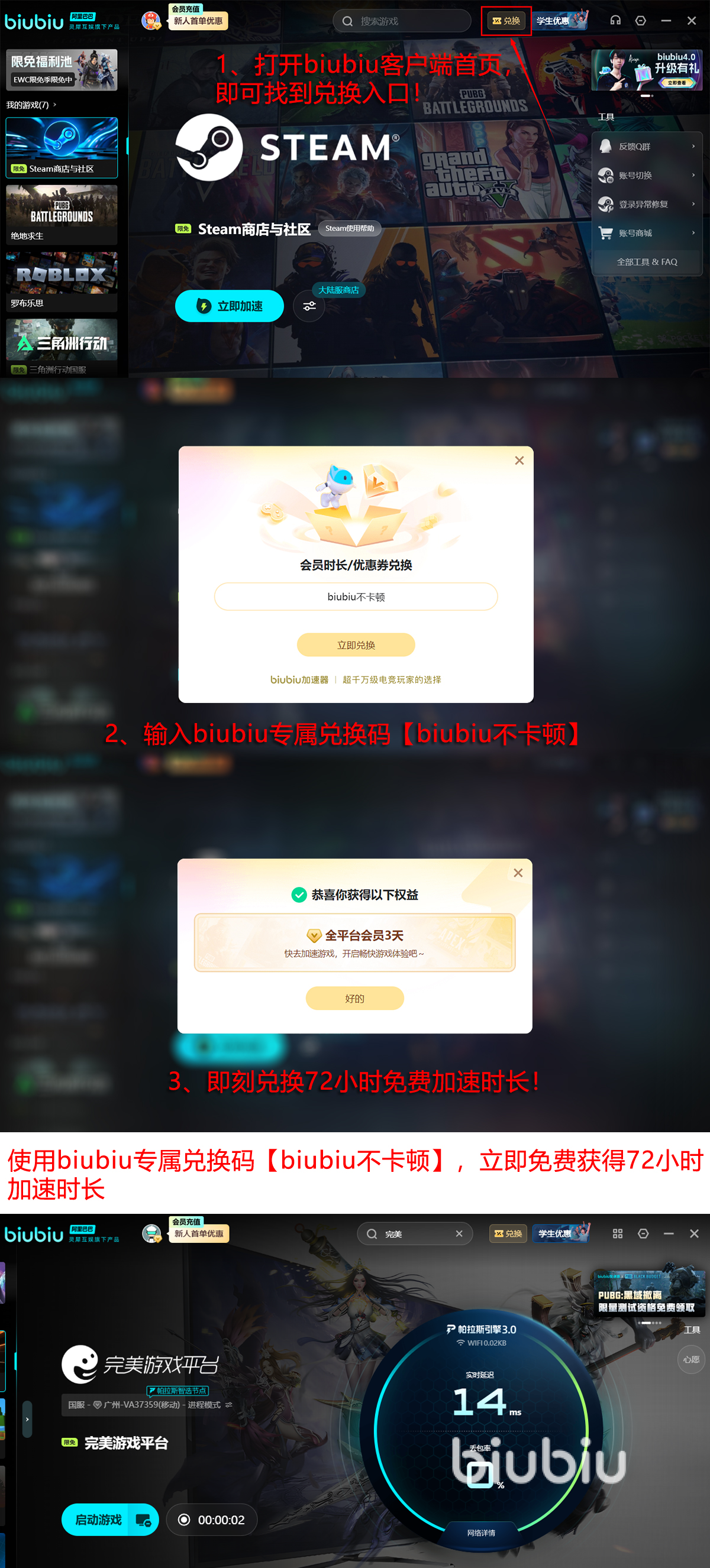 尚未尝试的用户无需担忧试用成本:新注册账号即可激活24小时全功能免费加速权限,覆盖所有完美平台支持的游戏。若需延长体验周期,无论新老用户,输入专属兑换码【biubiu不卡顿】,均可额外获得72小时无限制加速服务,便于深度测试不同网络环境下的稳定性表现,并同步邀请队友组建稳定开黑阵容,冲击更高段位排名。