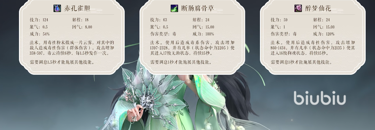 第二技能“断肠草”为关键增益型毒技,命中目标后可叠加攻击力提升效果,最高可叠至5层,每层提升固定比例毒伤;同时具备概率触发“无助”负面状态,使目标攻击强度降低25%,有效缓解承伤压力。第三技能“醉梦仙花”则聚焦于破防体系,成功施加后使目标防御值下降15%,持续8秒,与赤孔雀胆、九心海棠形成伤害倍率联动,显著放大整体毒系输出效率。
