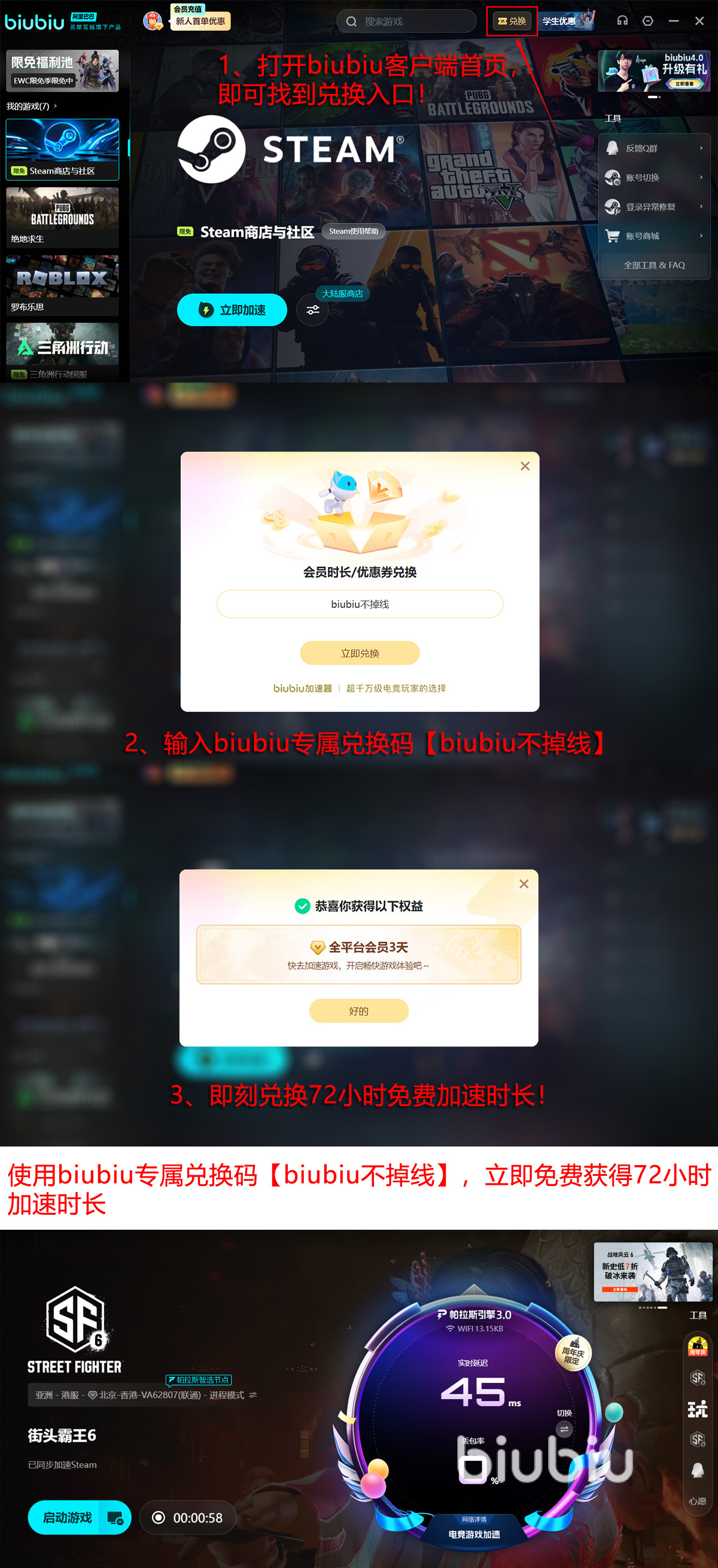 而且大家的福利也很实在:只要在兑换处输入【biubiu不掉线】,立马就能拿到3天免费加速。另外第一次注册并登录,系统会自动再送你24小时。这样两样加起来,你一共能体验96小时不付费。