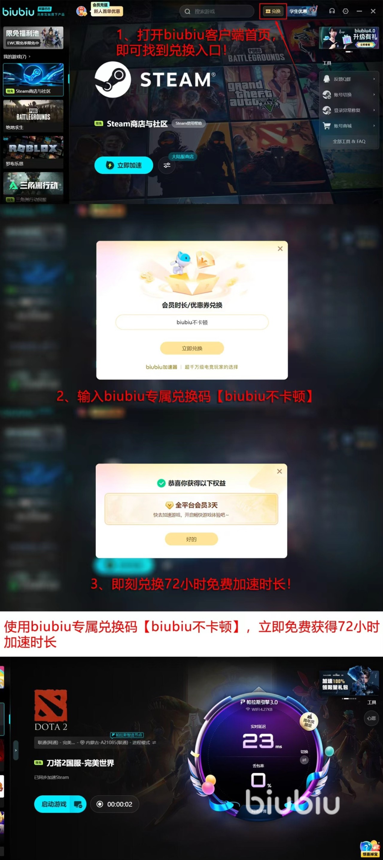 了解了一款工具的强大之处后,如何零成本开始体验才是大家最关心的,在这一点上,biubiu为玩家考虑的很周到,新用户成功注册后,账号中就会拥有24小时的免费加速时长,足够你打完数场完整的刀塔2对局,而且,平台还提供了一批兑换码【biubiu不卡顿】,所有用户都能使用这个码去兑换72小时的加速时间。