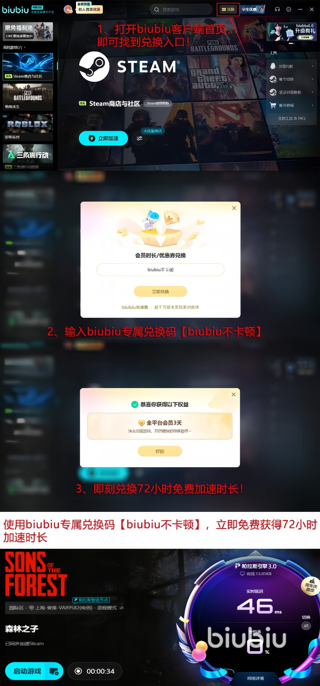 此次biubiu加速器对玩家们的诚意也是直接拉满!只要是biubiu加速器新注册的用户来到这就能获得24小时免费加速时长,这里再告诉大家一个新老用户均可使用的兑换码【biubiu不卡顿】,兑换之后还能再得到72小时的免费加速时长,对于新人来说两个时长可叠加在一起达到96小时!这样一来不仅仅只是你自己能体验到,可以喊上你的拉黑朋友一起来领取,提高整体的通关率。