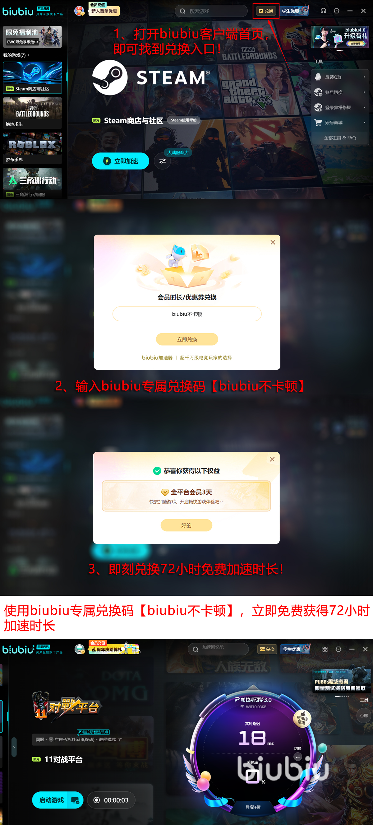 若是新人的话,注册后就能拥有24H的免费加速,可以先助大家感受一下这种加速效果!若是觉得不错的话,那就可输入兑换码【biubiu不卡顿】,即可额外畅享三天免费加速,这个优惠新老用户均可使用一次!特别是新人,就相当于直接白嫖了长达96H的免费加速时长,足以让自己提升几个小段位了!