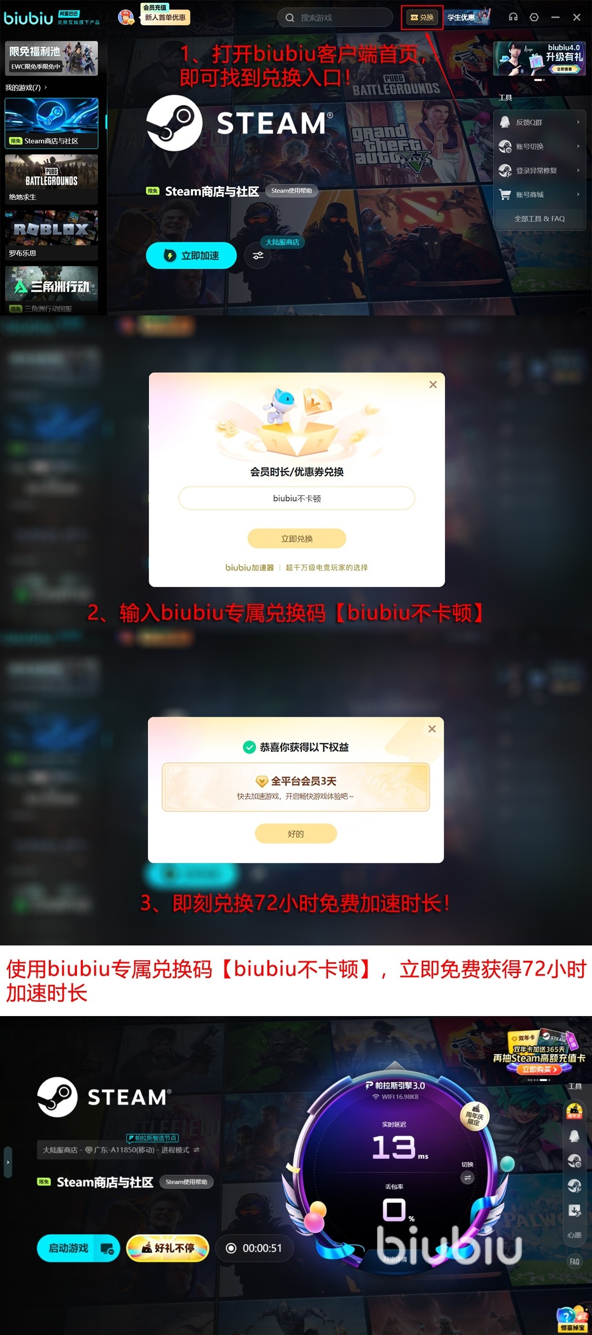 现在biubiu新用户注册登录可以免费用24小时,无门槛体验同样优质服务。有好消息是,各位新老用户可以输入兑换口令【biubiu不卡顿】再领3天体验时长,新人总计可获得高达96小时免费体验。