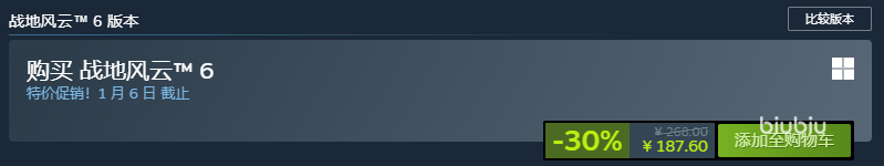 steam的冬季特卖,战地6的标准版的价格到了历史最低187.6元,相比于本身的268元的定价,降价幅度已经相当大了,达到了30%,价格足够亲民,可以算得上性价比极高,早些时候,在黑色星期五的促销活动中价格为227元。而这一次的冬季促销活动又一次把价格刷新了,给了玩家入手这款作品的最佳时机。