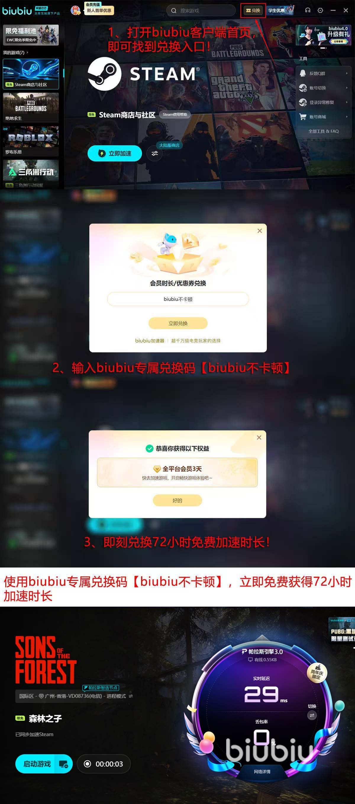 biubiu的加速效果得到了很多玩家的见证,当然,如果大家喜欢玩的游戏不在此次冬促限免池中,那也不用担心, 其实还是有其他福利时间可以领,首先是注册时的新手福利,新账号注册后就有24小时即时福利时长,之后还能通过参加口令兑换,在领到72小时福利,这个只需用【biubiu不卡顿】这个口令在客户端相应的位置上兑换就行了,因此新人实际能有96小时的免费体验时间,足够大家在冬促期间充分体验biubiu了。