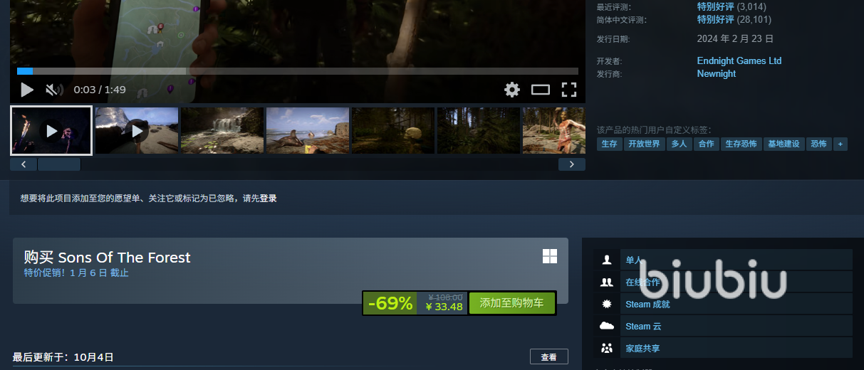 最后就是森林之子史低多少钱的问题,这次冬促的价格大家就赶紧入手吧。不过还是要提醒大家,目前冬促期间,用biubiu提速Steam商店下载速度是免费的,同时包括EPIC商店也是同样限免的,大家要紧抓这个好机会,再在玩游戏的时候,用用biubiu可解决网络上的大部分问题,这些大家可以多多体验。