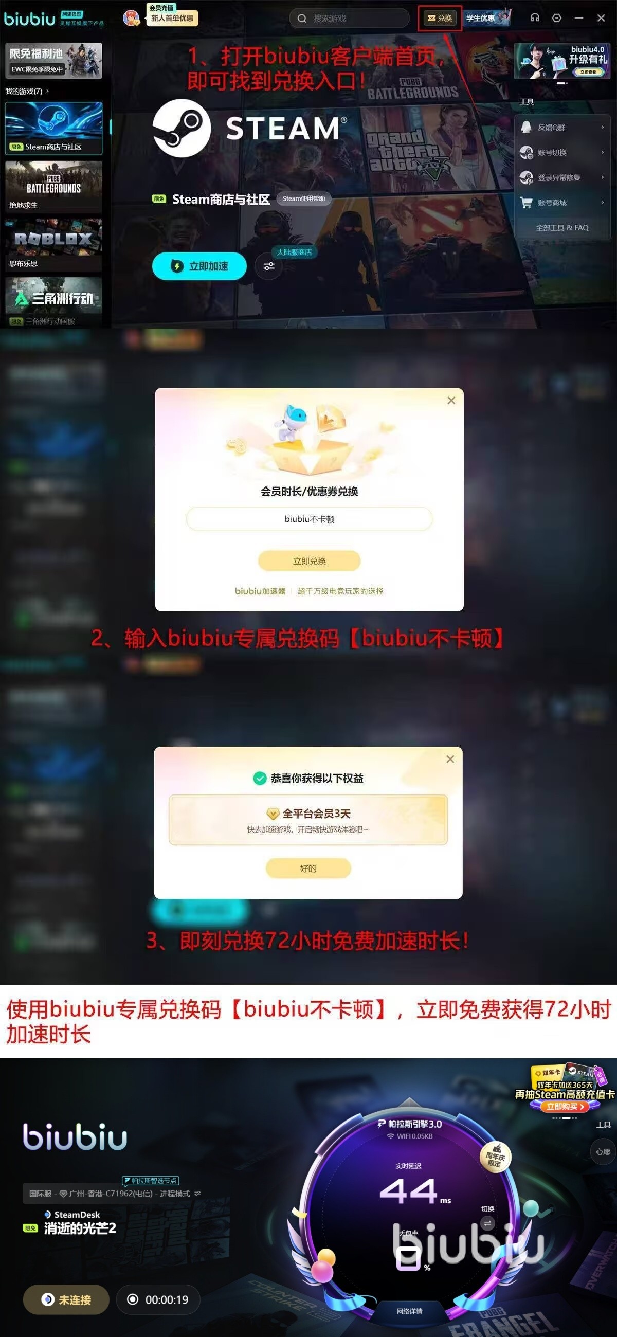 对于福利方面也是给大家准备了大大的惊喜,限时12月18日到1月18日的限免加速池,超多类似消逝光芒2的大作可以尽情享受免费加速服务。而针对新人也准别了首次注册登录就能拿到平台赠送的24h免费体验权限,【biubiu不卡顿】这句口令只要正确输入,直接就能兑换到三天的继续免费优化时间。真正的零成本体验该加速工具所带来的优化服务,同时后续的会员充值,也给大家准备了超多的折扣,学生群体还能通过学信网的验证码,兑换专属折扣。