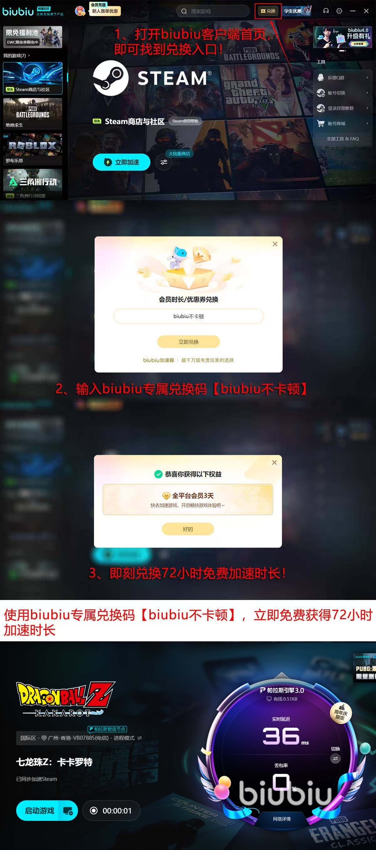 由于冬促期间的下载量,在线人数涨幅都会变的异常高,毕竟还有一个圣诞节假期,大家在此期间有机会体验的biubiu,在极端网络环境下的加速性能,更重要的是可以免费体验的,因为注册就有24小时免费加速时间的领取,在此之后还能通过 参加口令福利再领到72小时,这个活动用【biubiu不卡顿】在客户端特定位置处兑换就可以了,因此实际上 一个人总共是能有96小时免费时间的。