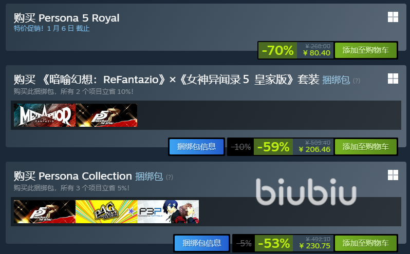 所以,女神异闻录5皇家版史低多少钱?此时此刻的steam冬促期间价格,就是史低最低价格,也是最佳的入手时间。最后,小编要和大家说下,下载游戏和运行游戏一定要使用biubiu加速器,来提速,既可以让游戏玩的开心,也是给大家节省大量的时间。