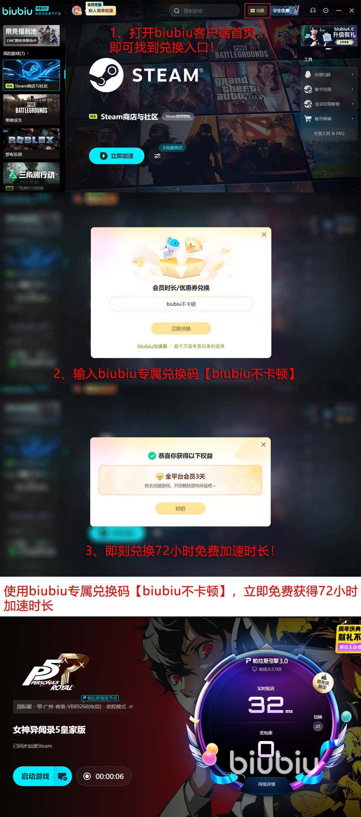 其实,冬促期间,这么低的价格促销游戏,必然会让游戏持续出现在线高峰,玩游戏的网络必然受到影响,如果游戏不在steam的限免名单,大家也不用担心,没有好网络玩游戏,因为biubiu还是有免费加速时间能的,注册账号后就能有24小时免费领取,这个是直接送到账号,不需要单独领取,之后有一个72小时的口令福利可领取,在客户端首页用【biubiu不卡顿】直接兑换到的,如果游戏在限免,这个可在限免结束后用,总体上,一个新人总计能得到的免费时间是96小时。