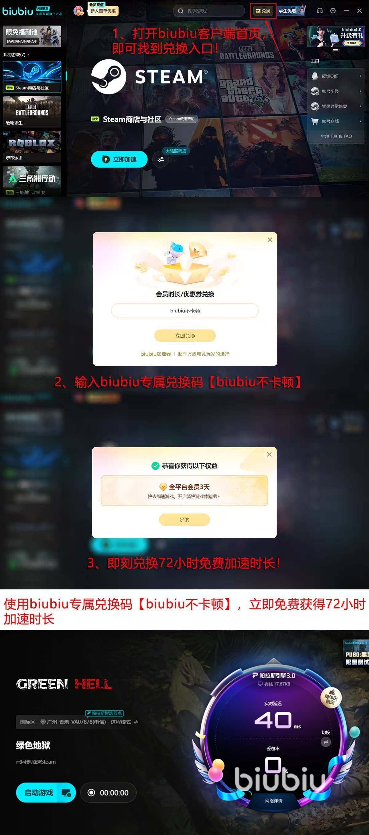 在冬促限免期间,如果大家爱玩的游戏没有限免,该如何体验到biubiu加速效果呢?其实,biubiu自身是有福利时间送的,注册账号后,首先会有24小时免费时长送给大家,24小时是不限制任何游戏加速的,功能全部可用。另外,如果不够之后还可以用【biubiu不卡顿】这个口令,参加老会员口令兑换活动,再领取到72小时 ,如果游戏有限免,口令活动可在限免结束后使用,没有时间限制,不管怎样,一个新人总共能有96小时的免费加速福利。