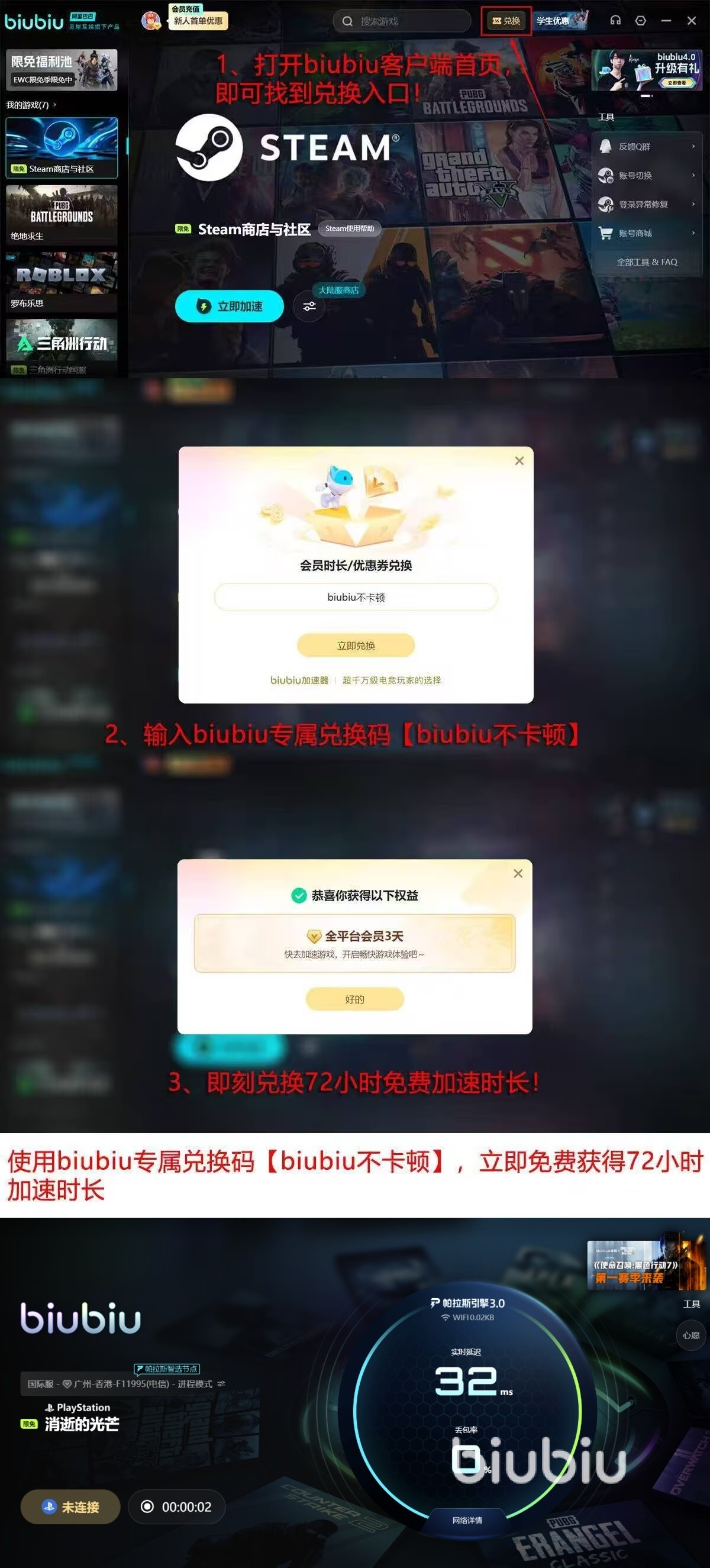 现在点击文中链接可以领到去biubiu为新人准备的24h全平台免费加速权限,零门槛体验专业化网络优化。而兑换界面的兑换口令【biubiu不卡顿】,还能在原来的基础上得到三天继续加速的权限。12月18号至1月18号这个时间段是biubiu为大家准备的冬促活动,限免的加速池中,覆盖了当前市面上海量的游戏资源,都是可以随意搜索启动畅玩,不需要任何的付费就能享受到流畅的优化服务。