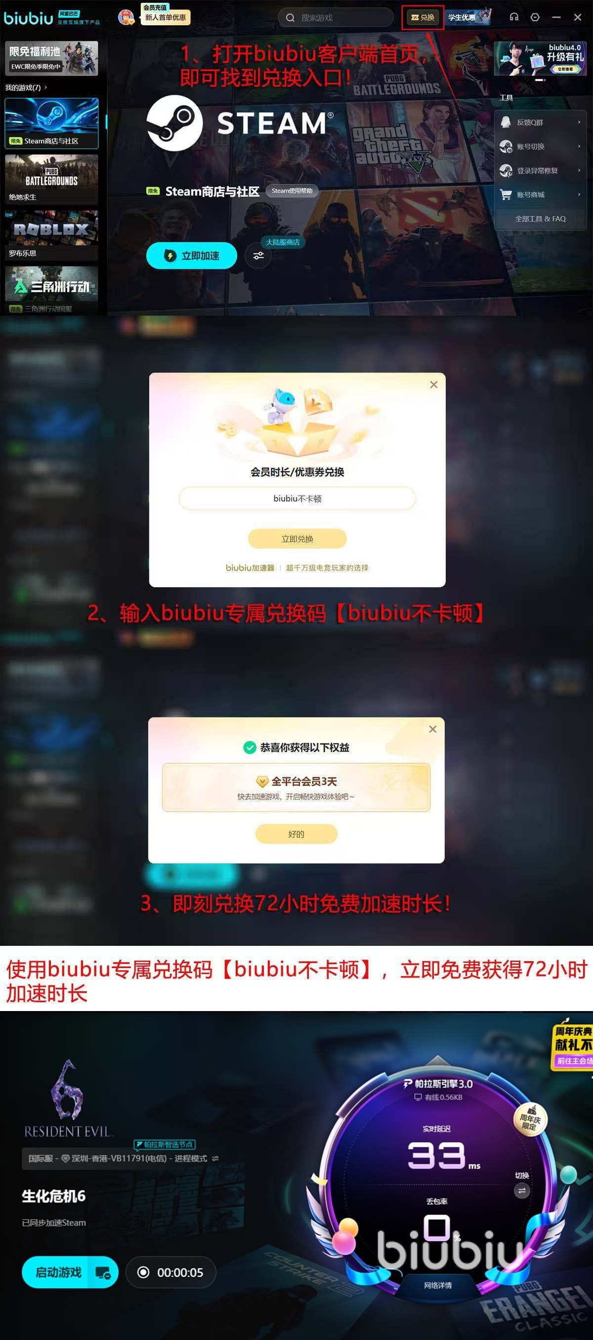 生化危机6在角色动作还有游戏关卡的设置上,节奏更快,所以网络质量一定要稳定,大家提前做好网络准备,而且现在biubiu还有免费的加速时间可以领取,足足有4天时间,只要注册账号就能立刻得到系统送的24小时免费时间,另外还没有更多的七十二个小时口令福利领取,在客户端封面图兑换窗口,使用【biubiu不卡顿】就能直接兑换到,因此能得到时间是96小时。
