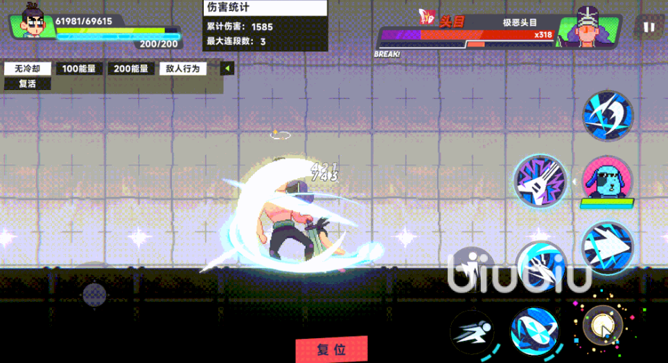 每位可操作角色均具备统一的操作维度:普通攻击、两个主动技能、终极技能(大招)、方向移动、跳跃以及闪避。其中普攻为无消耗基础输出手段,但段数因角色而异——例如汪疯为三段连击,伍六七则为四段连击。小技能受独立冷却时间约束;大招除需满足冷却条件外,还需消耗气力值,该数值可通过自然恢复或命中敌人两种方式补充。