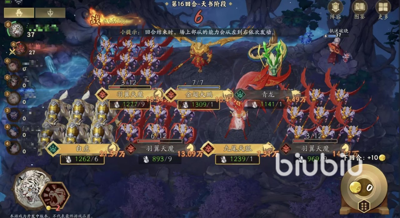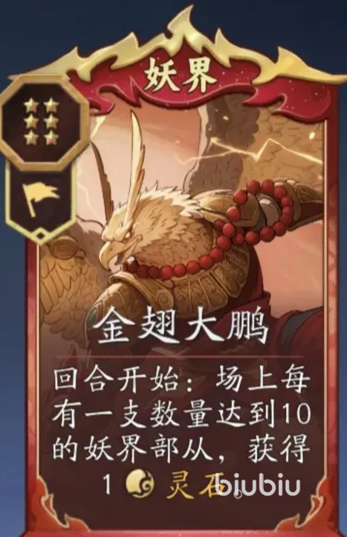 当阵容升至5本后,消费流正式进入高阶运转周期。羽翼天魔成为核心引擎,其技能“场上每存在1名妖界突击部从,所有突击部从+1数量”构成指数级成长起点;金翅大鹏则承接该增益,按当前突击部从总数每回合固定产出灵石;而九尾天狐进一步强化循环效率——其技能可使“消费灵石所获进度计数翻倍”,实现乘法叠加效应。雷鸟怪在此阶段同样不可或缺,其战吼与消费效果均可直接增加突击部从数量,显著提升整体输出密度与续航能力,与大鹏、九尾形成闭环协作。