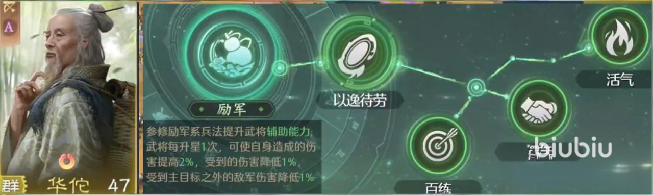 华佗承担全队治疗与辅助职责,必备技能为【天香】与【陷阵营】,前者提供单体高额恢复,后者赋予群体减伤与持续回血效果。若【陷阵营】尚未解锁,可选用【刮骨】或【后勤】等具备明确治疗量的技能作为过渡方案,确保队伍整体续航能力不受影响。