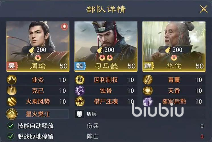 兵种方面,推荐统一配置盾兵,且要求该兵种基础减伤持续时间达到3秒;同时,需确保每名盾兵单位额外获得30%属性加成,以强化前排承伤能力。战法搭配上,周瑜可选用【军略】【五则攻之】【集智】【集气】【雷霆】等提升爆发与连击效率的策略;司马懿优先选择【军略】【计成得势】以增强技能衔接与状态转化;华佗则适配【励军】【诱敌而击】,兼顾团队增益与战术牵制。