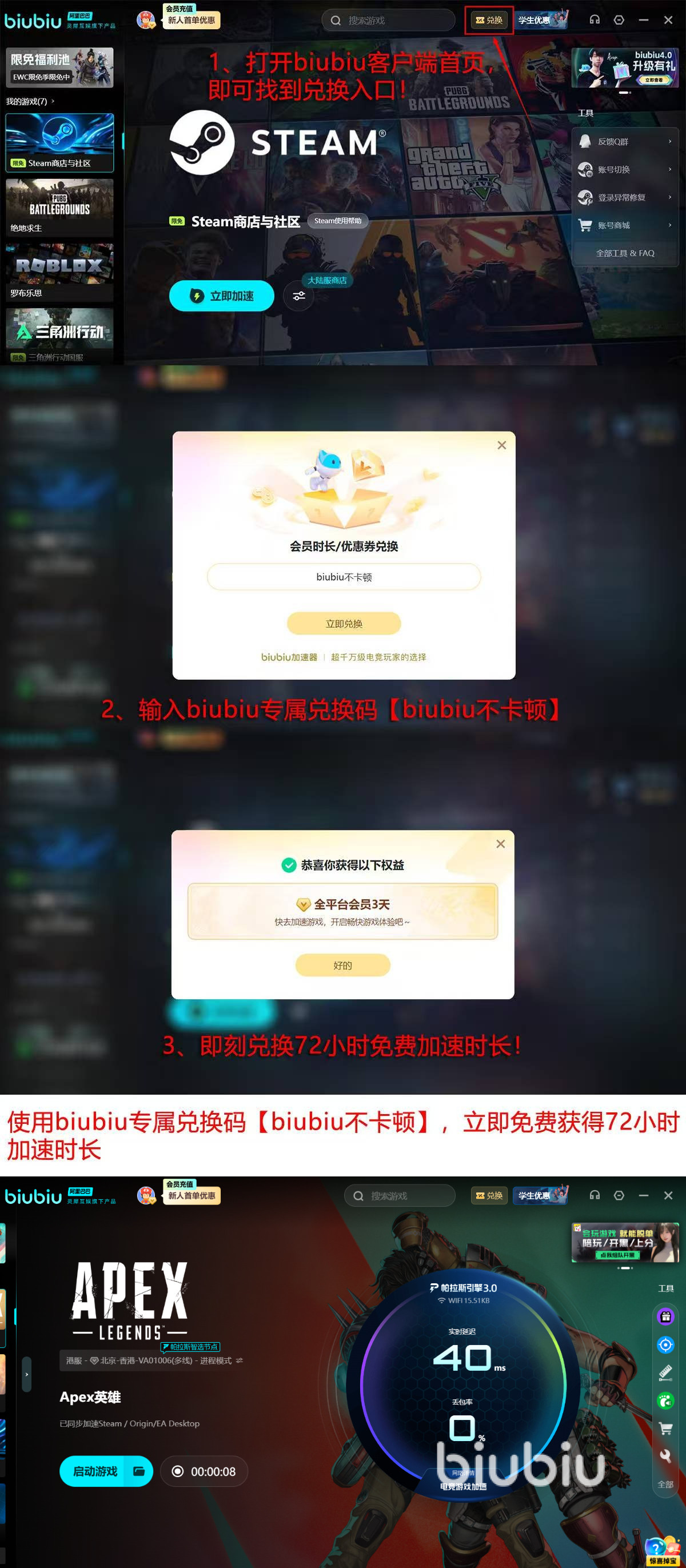 新用户注册即赠24小时无门槛加速服务,使用专属口令【biubiu不卡顿】可额外激活72小时高品质加速权益,累计享96小时免费加速时长。